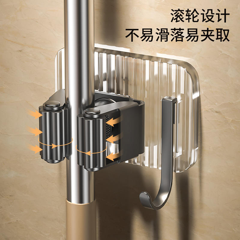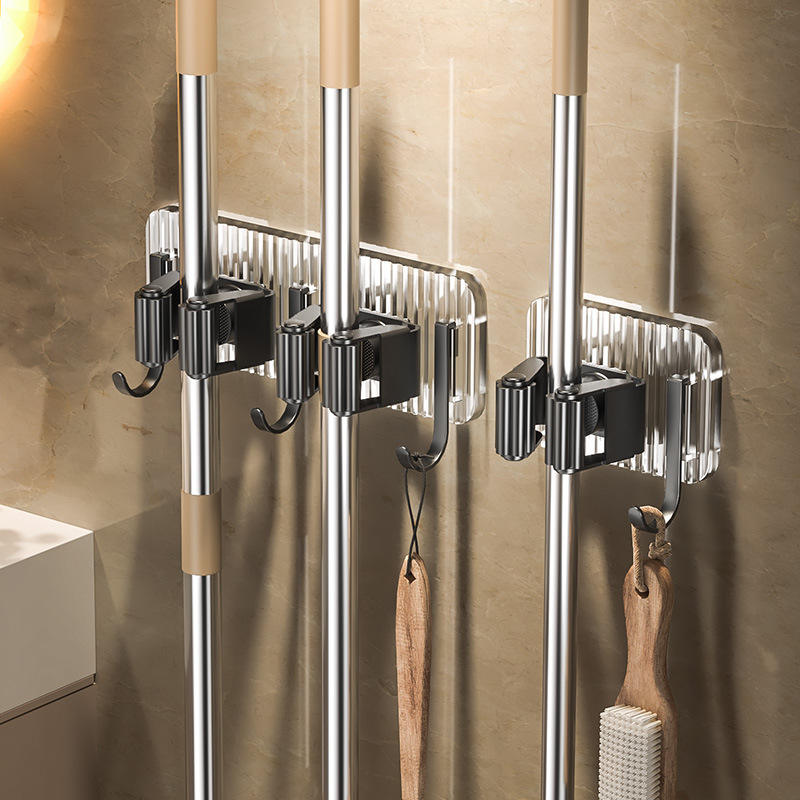 ที่แขวนไม้ถูพื้นสแตนเลสแบบติดผนัง รูปทรงสี่เหลี่ยมผืนผ้า ไม่ต้องเจาะผนัง ชั้นวางเก็บอุปกรณ์ทำความสะอาดในครัว พร้อมตะขอสำหรับไม้กวาดและไม้ถูพื้น