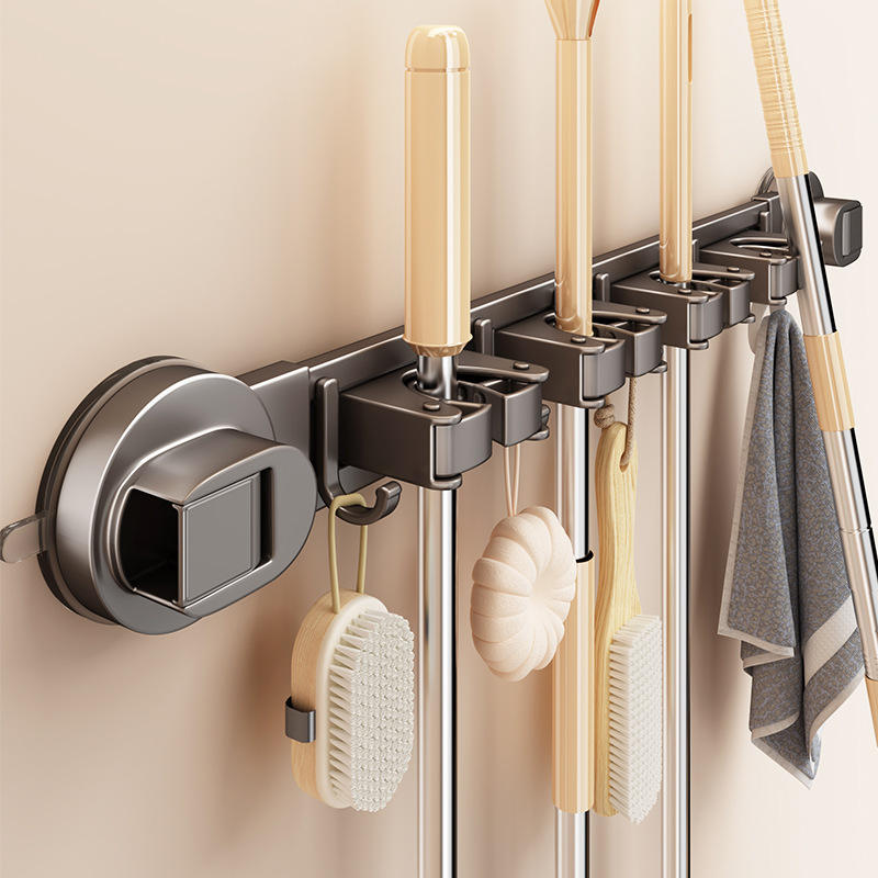 ที่แขวนไม้ถูพื้นแบบถ้วยดูด 5 คลิป 6 ตะขอ - สีเทาปืน