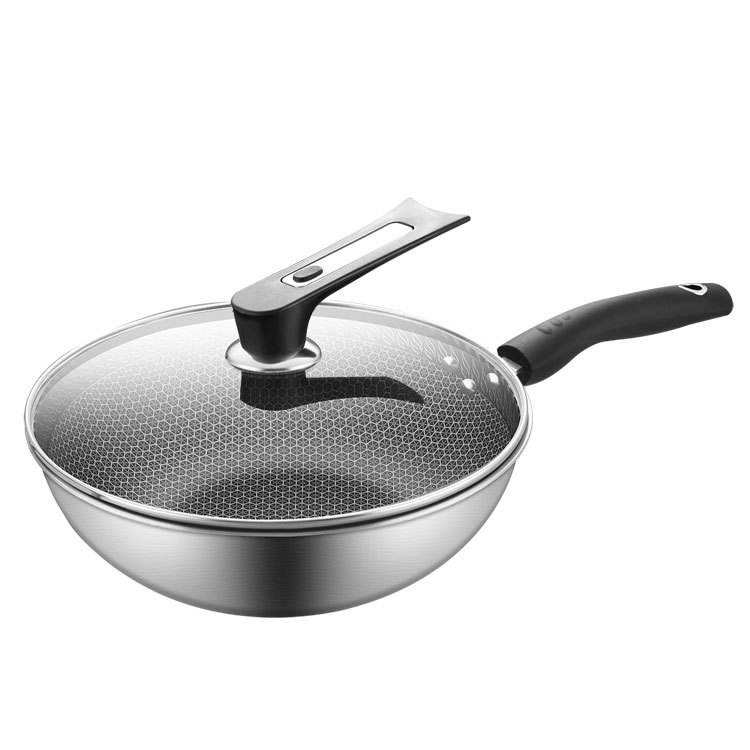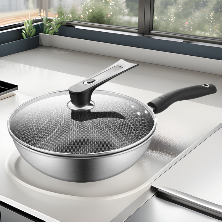 กระทะสแตนเลสก้นแบนแบบไม่ติดกระทะสำหรับเตาแก๊สและเตาแม่เหล็กไฟฟ้า พร้อมฝาปิดสำหรับทำอาหารในครัวเรือน