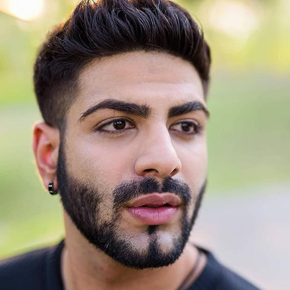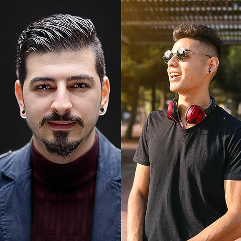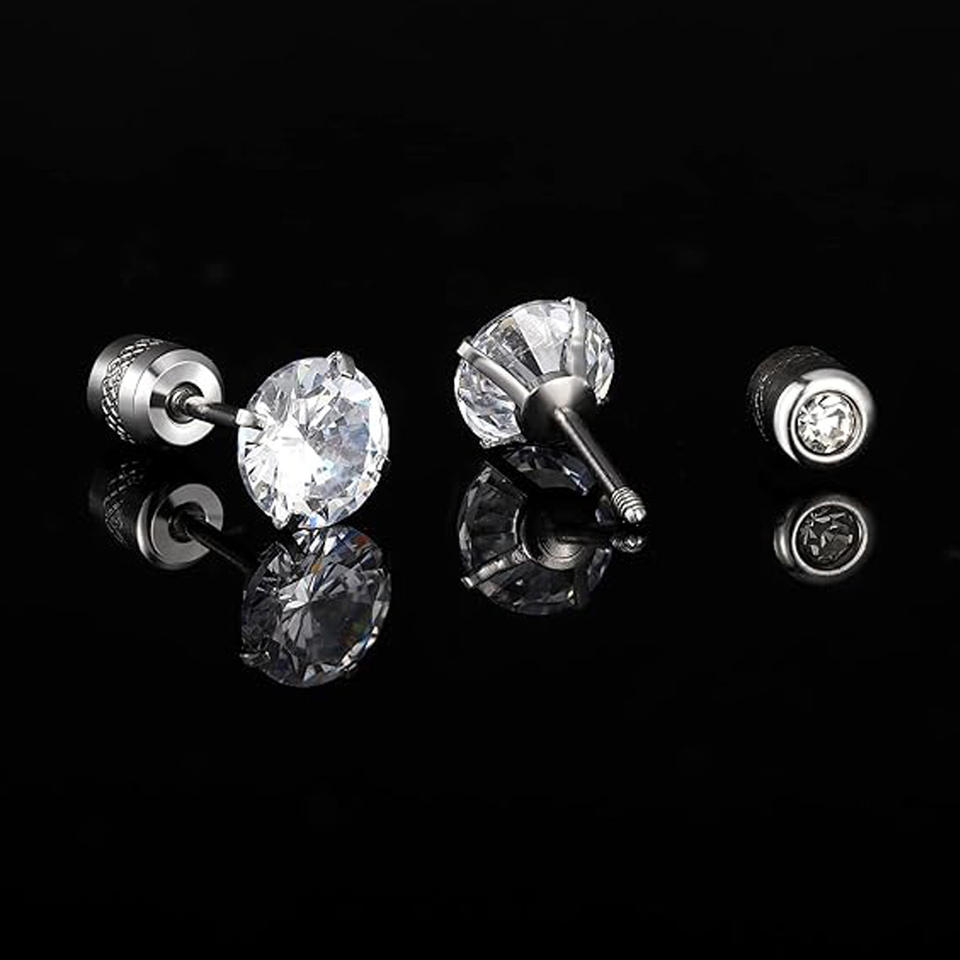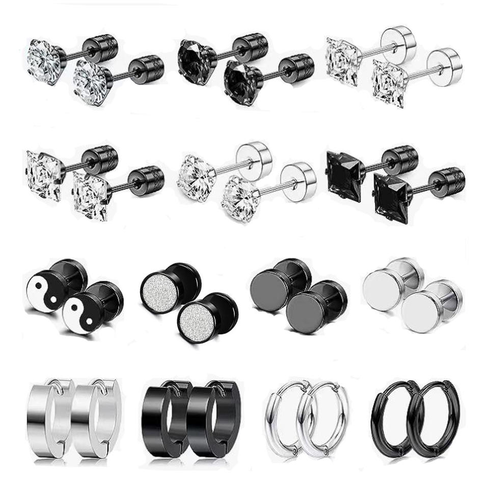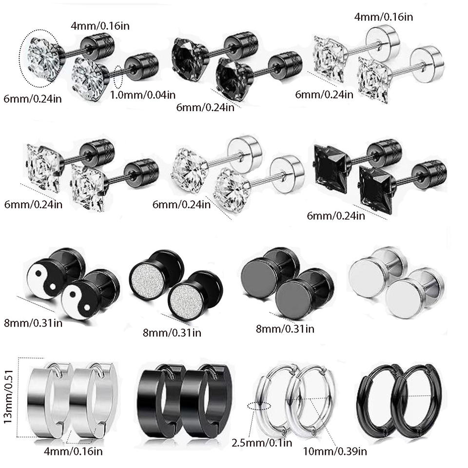 ชุดต่างหูสแตนเลสประดับเซอร์คอน 14 คู่ สำหรับผู้ชายและผู้หญิง ต่างหูบาร์เบลสีเงิน ดีไซน์เรขาคณิตสีดำ