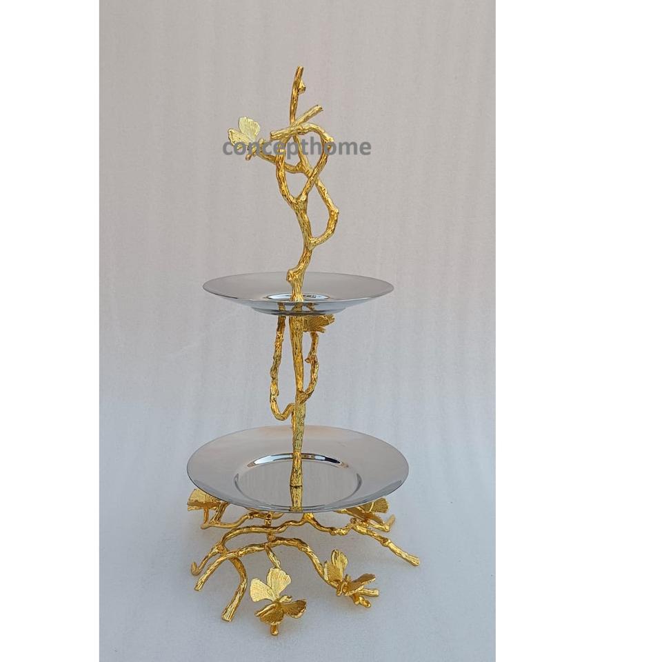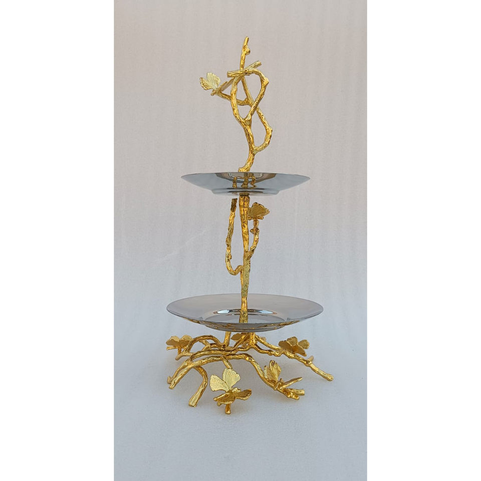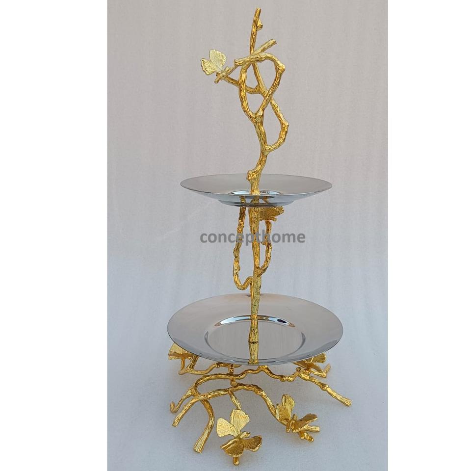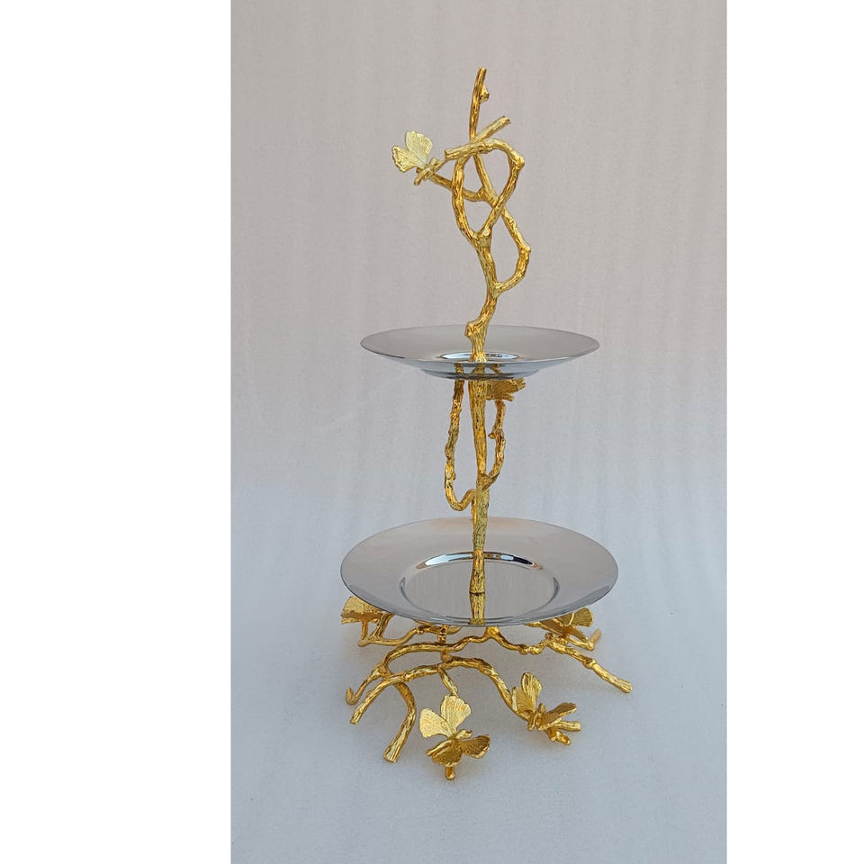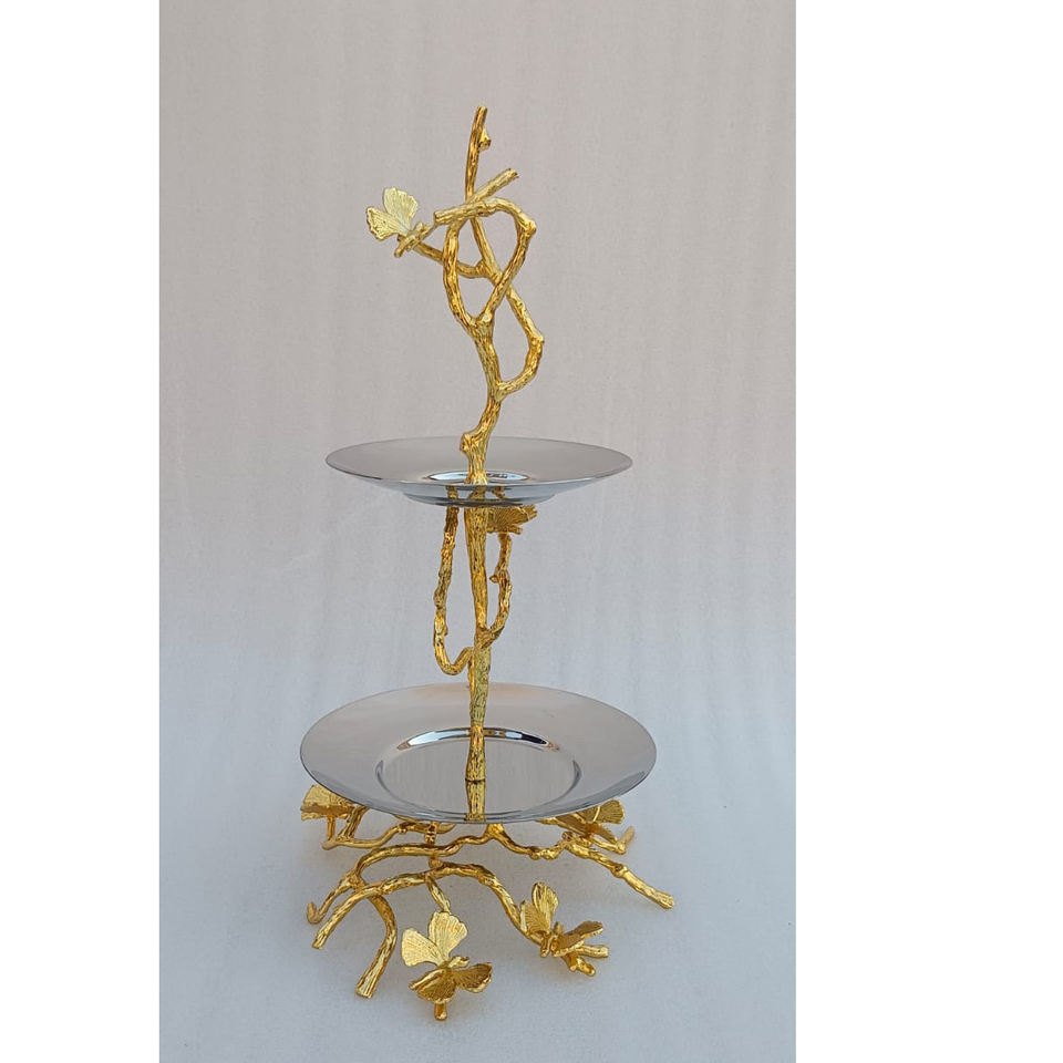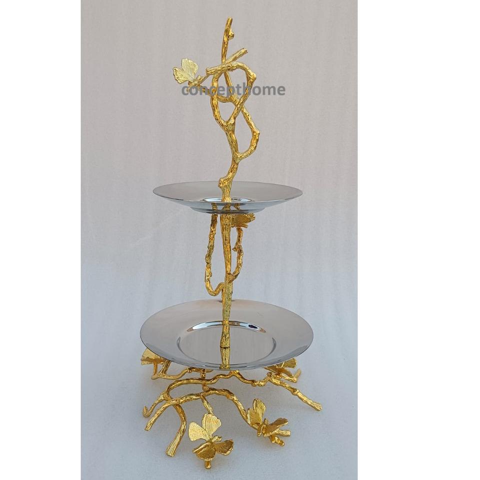 ถาดเสิร์ฟ 2 ชั้น สแตนเลสและทองเหลือง สำหรับของหวาน ผลไม้ ขนม คัพเค้ก และเค้ก ลายผีเสื้อ
