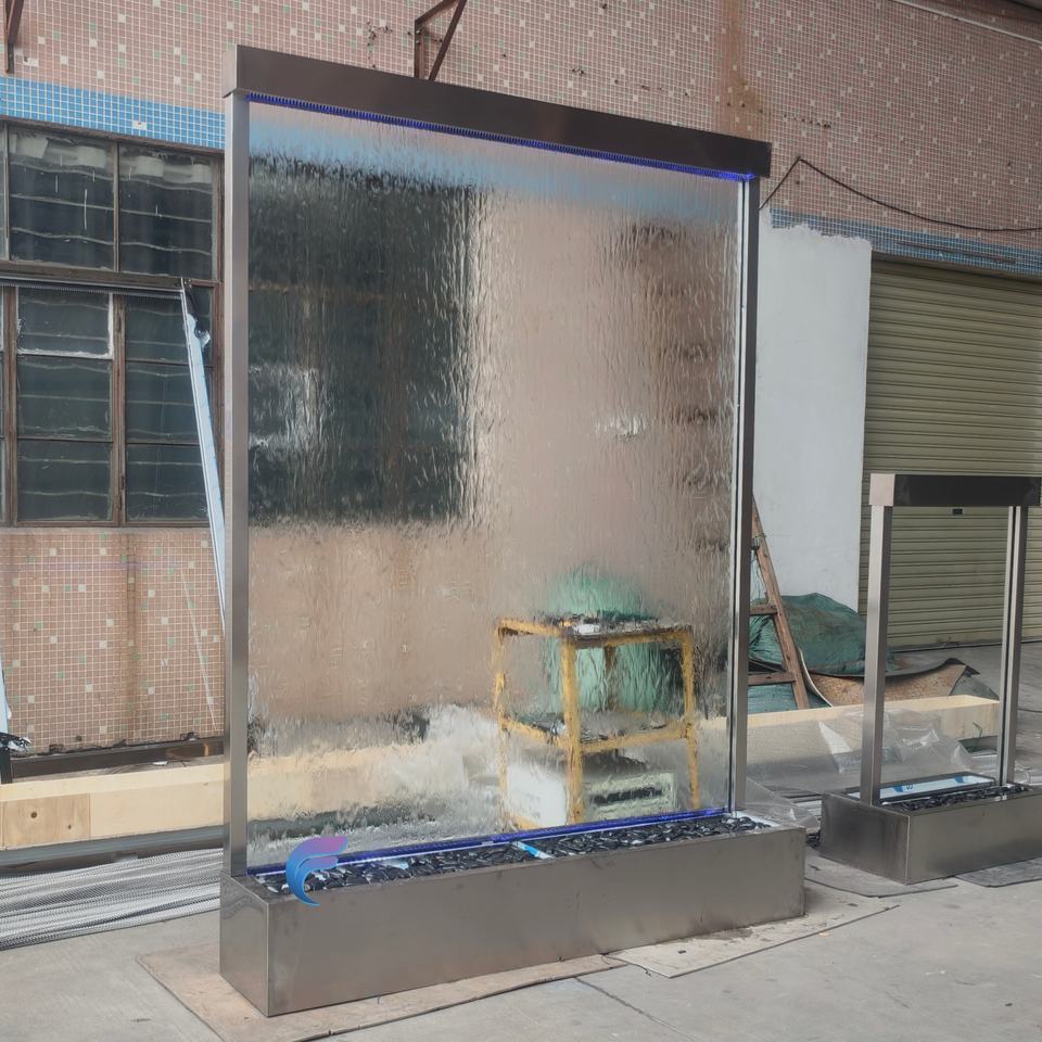 น้ำพุติดผนังสแตนเลสสำหรับตกแต่งภายในอาคาร น้ำพุแบบแขวนผนังพร้อมกระจก น้ำพุแบบไหลผ่านกระจก