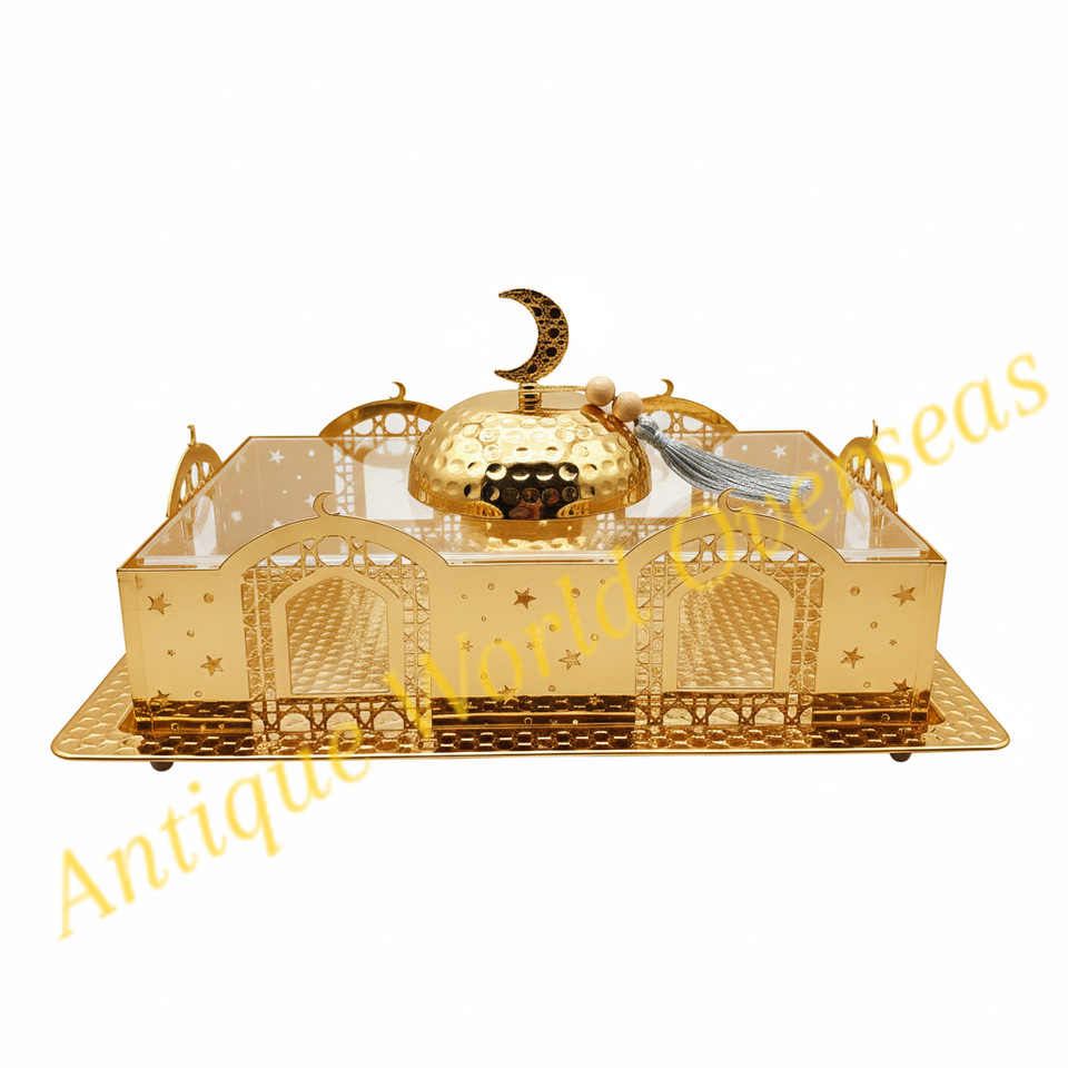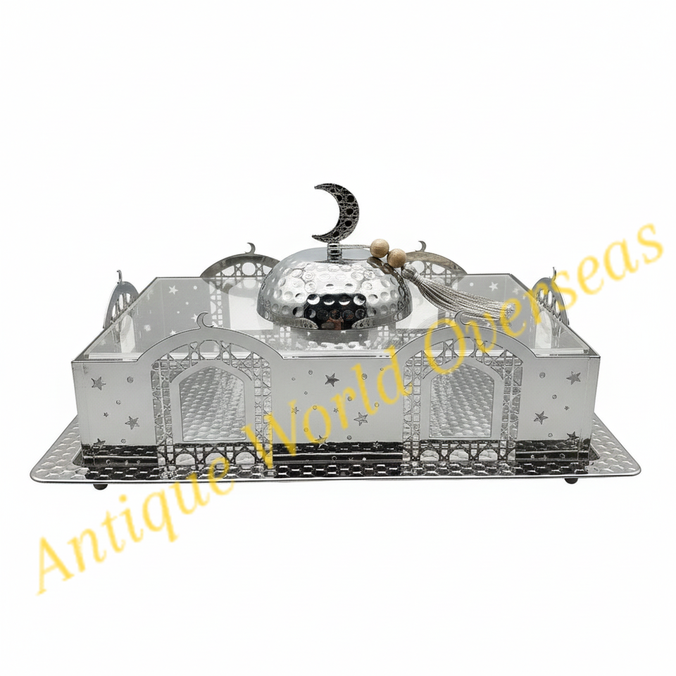 ถาดเสิร์ฟสแตนเลสพร้อมฝาโดมลายตอกแบบครึ่งวงกลมและลายมัสยิดแบบตัดด้วยเลเซอร์สำหรับตกแต่งโต๊ะในงานเทศกาล