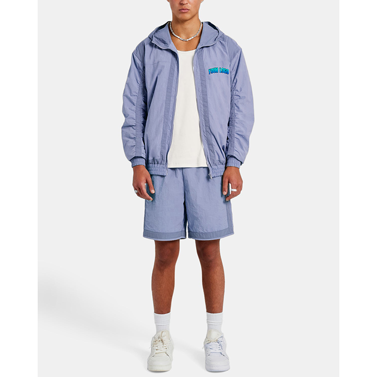 เสื้อแจ็คเก็ตวินด์เบรกเกอร์คอตั้งแบบสองชิ้นสำหรับผู้ชาย พร้อมกางเกงขาสั้น ชุดเซ็ตพิมพ์ลายโพลีเอสเตอร์แบบซับลิเมชั่นตามสั่ง