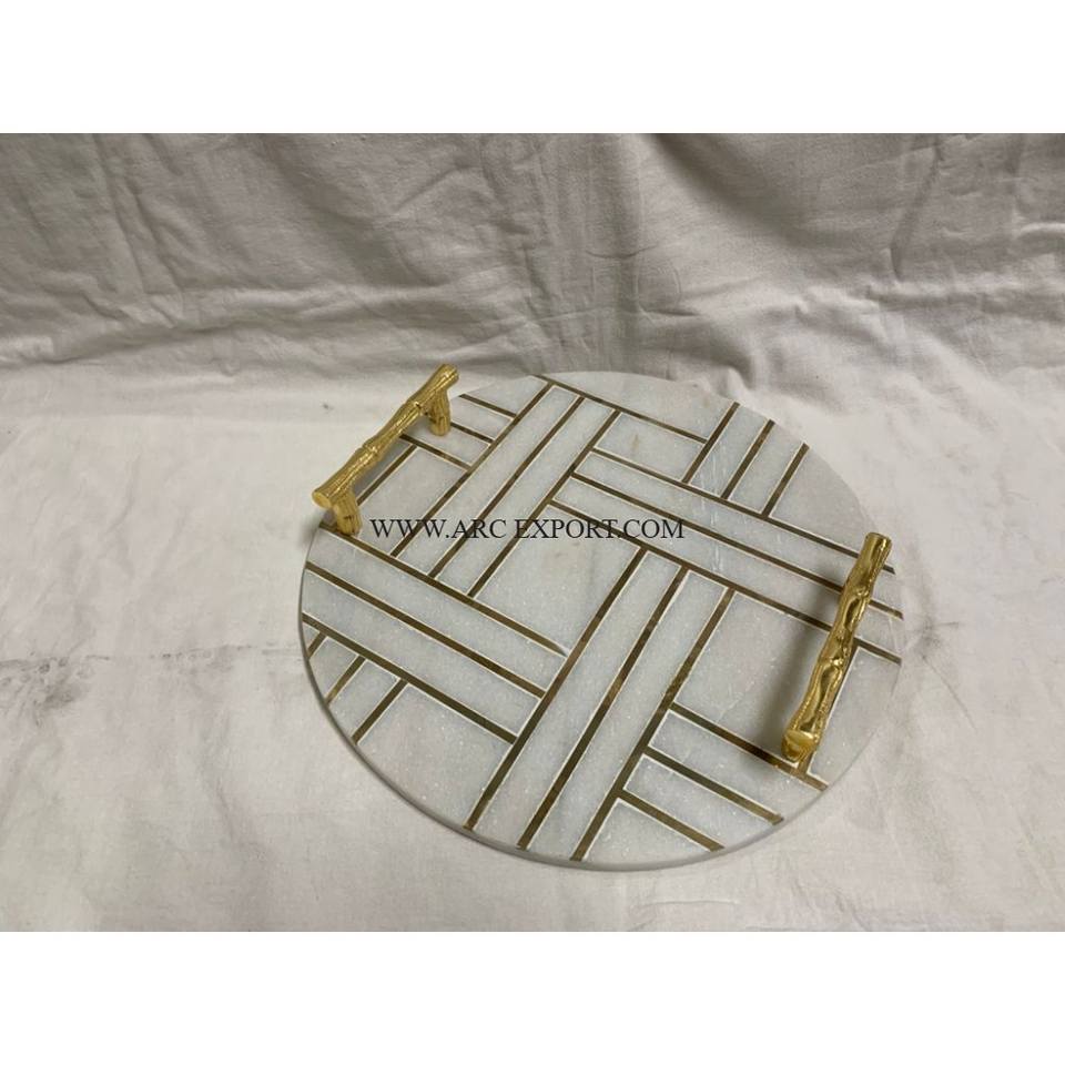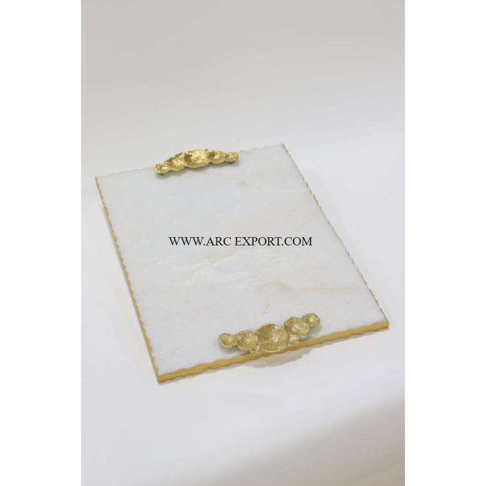 ถาดเสิร์ฟอาหารพร้อมที่จับดอกไม้สำหรับตกแต่งโต๊ะดีไซน์เนอร์ถาดทองเหลืองลายหินอ่อนแนววินเทจ