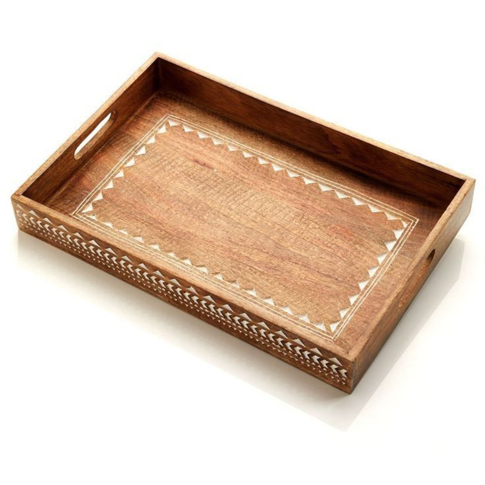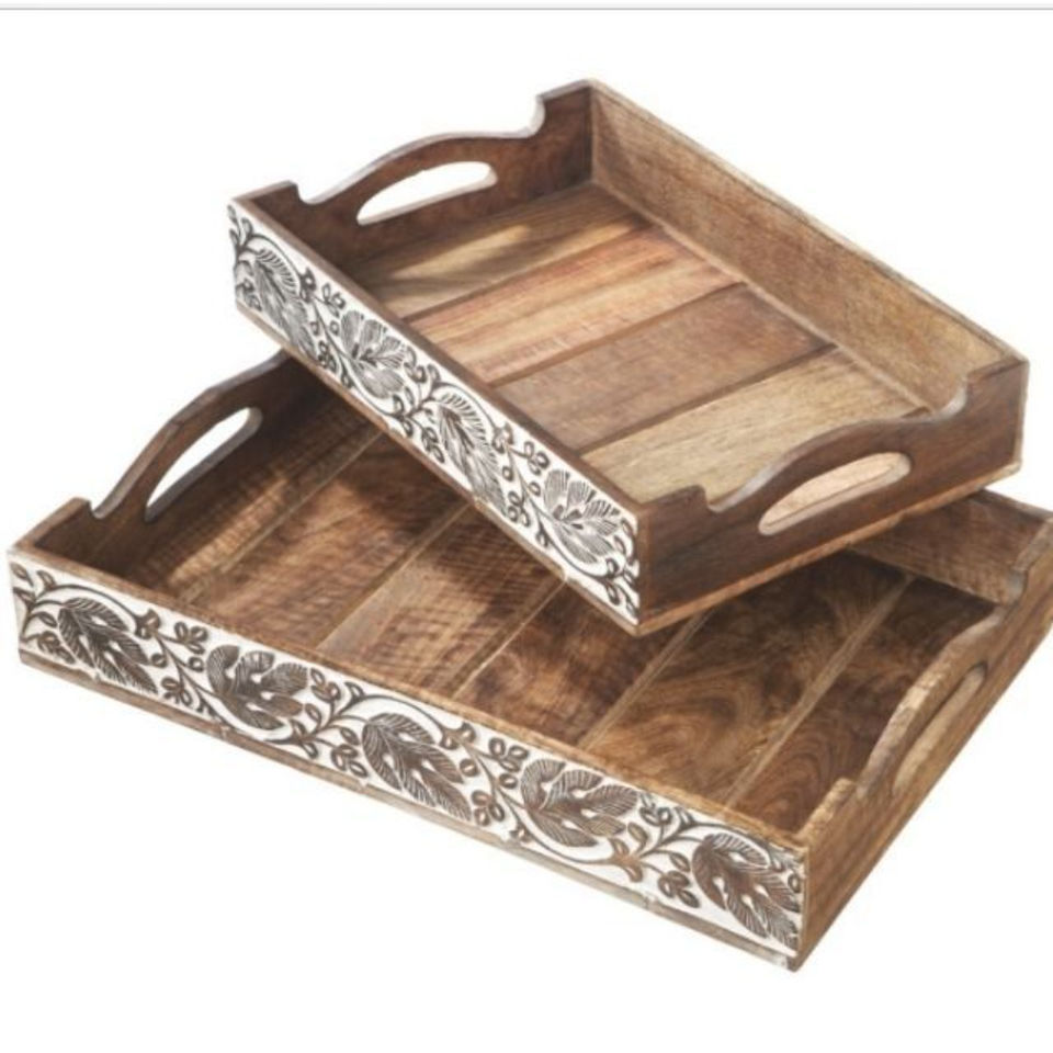 ถาดเสิร์ฟไม้มะม่วงทำมือแบบมาตรฐาน พร้อมหูจับ สีขาว ลายดอกไม้แกะสลักด้วยมือ สำหรับใช้ในครัว ตกแต่งบ้าน และร้านอาหาร