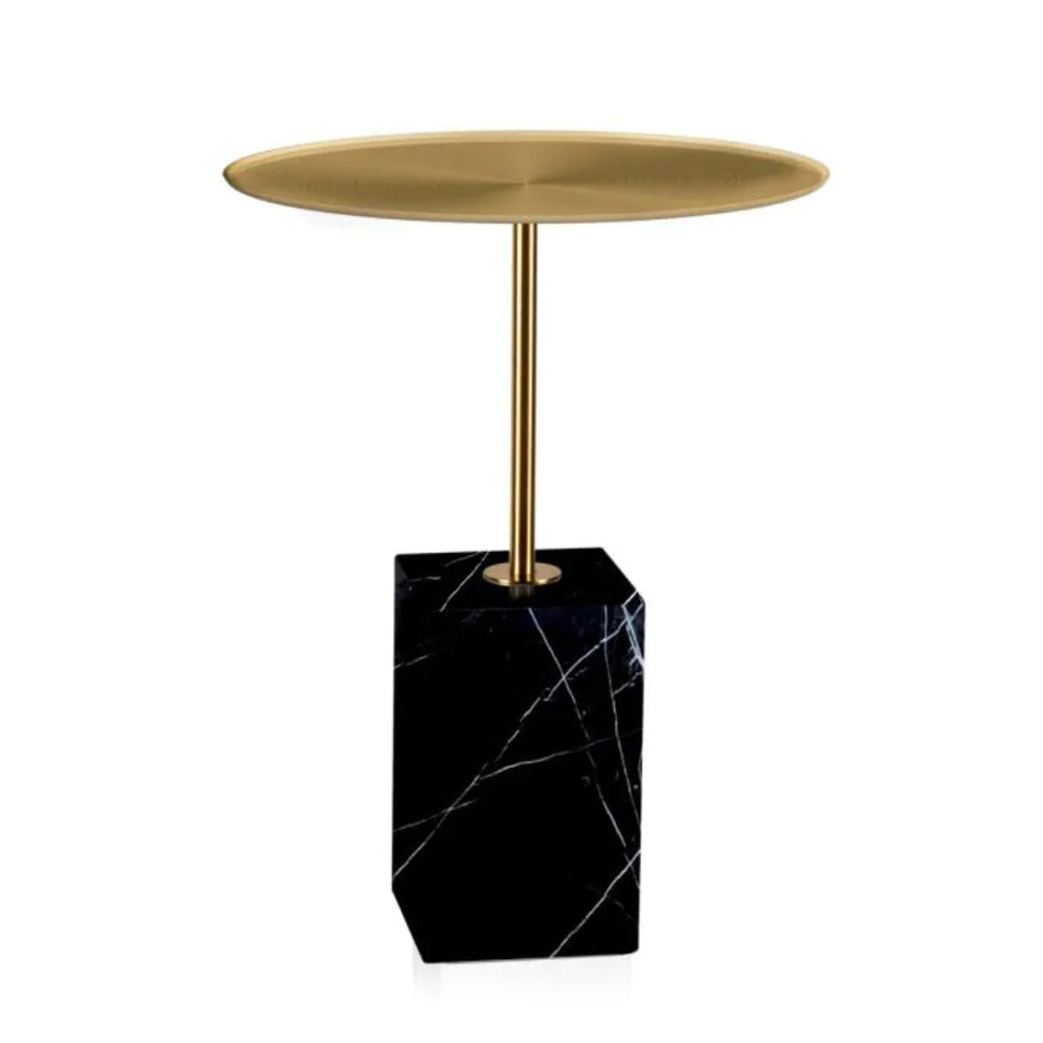 โต๊ะกาแฟและโต๊ะข้างทรงกลมหรูหรา หน้าท็อปโลหะคุณภาพสูงชุบทอง ฐานหินอ่อนสีดำแบบมาตรฐาน