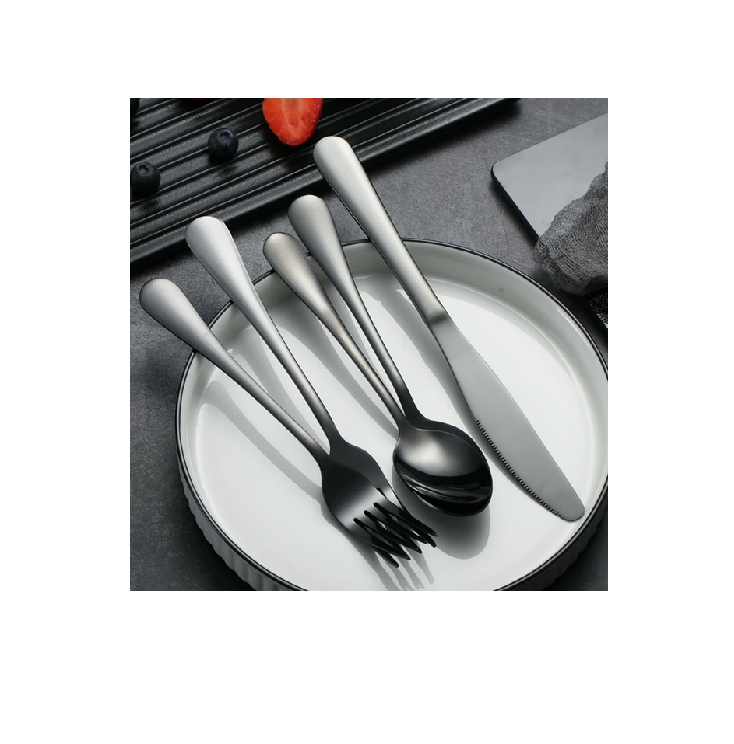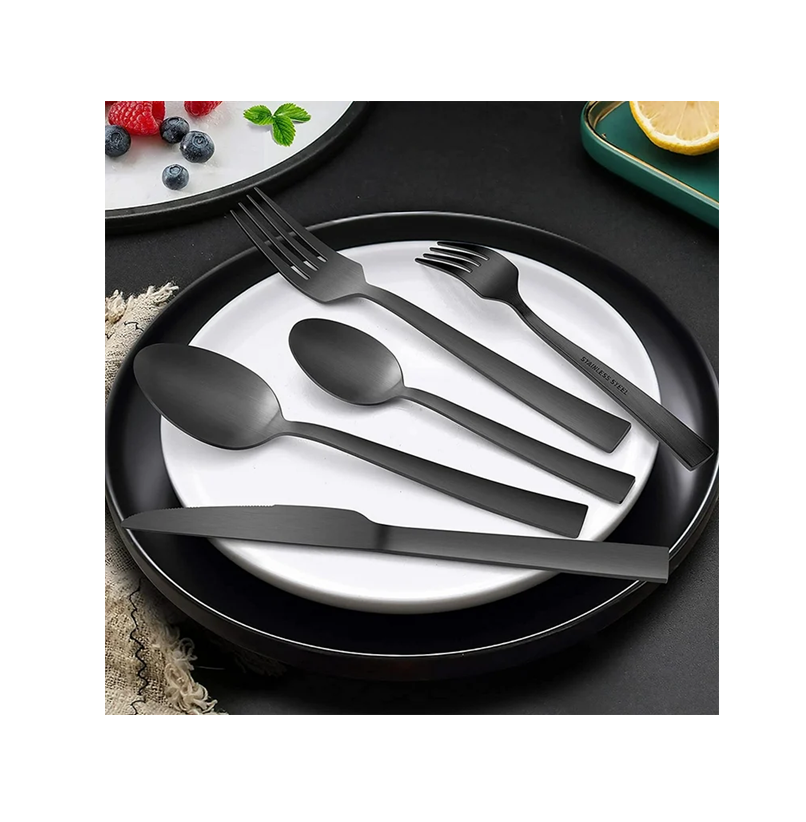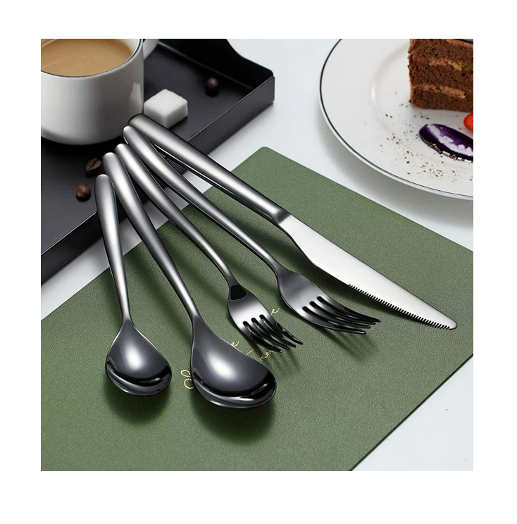 ชุดเครื่องใช้บนโต๊ะอาหารโลหะสีดำดีไซน์หรูหราทำด้วยมือมิเรอร์เหล็กชุดช้อนส้อมสีที่กำหนดเอง