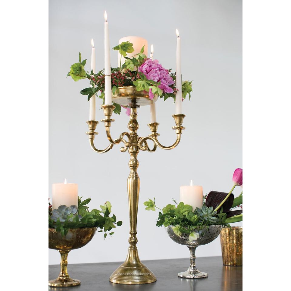 เชิงเทียนตั้งพื้นสีเงิน5แขนสำหรับงานแต่งงานและตกแต่งบ้านทำด้วยมือเชิงเทียนอลูมิเนียม