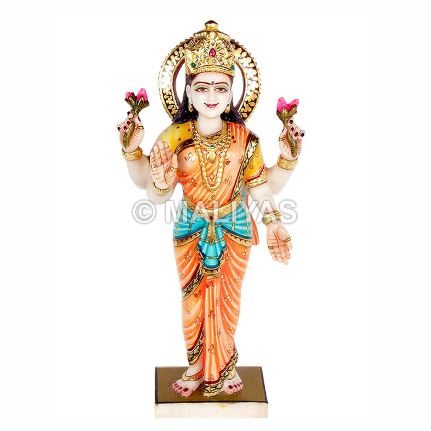 รูปปั้นพระลักษมีหินอ่อนแบบยืน | รูปปั้นพระลักษมีหินอ่อนทำมือสำหรับบ้านและวัด – มาลียาส