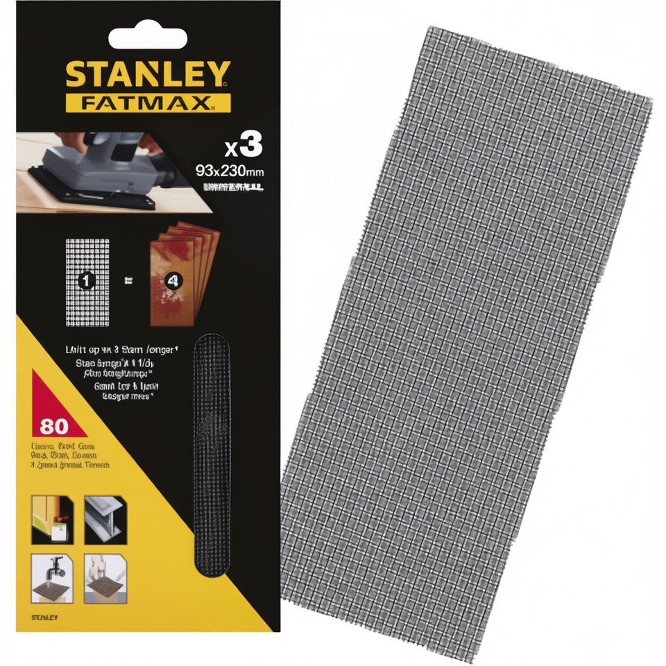 แผ่นกระดาษทรายตาข่ายสแตนลีย์ 1/3 ขนาด 93 x 230 มม. แบบไม่มีเวลโคร แพ็คหลายชิ้น