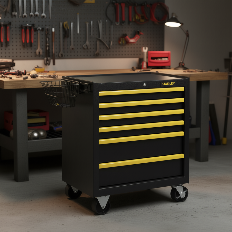 รถเข็นเครื่องมือ Stanley Workshop Trolley 6 ลิ้นชัก ขนาด 26 นิ้ว พร้อมตะกร้าเก็บของ สำหรับใช้ในโรงรถและโรงงาน