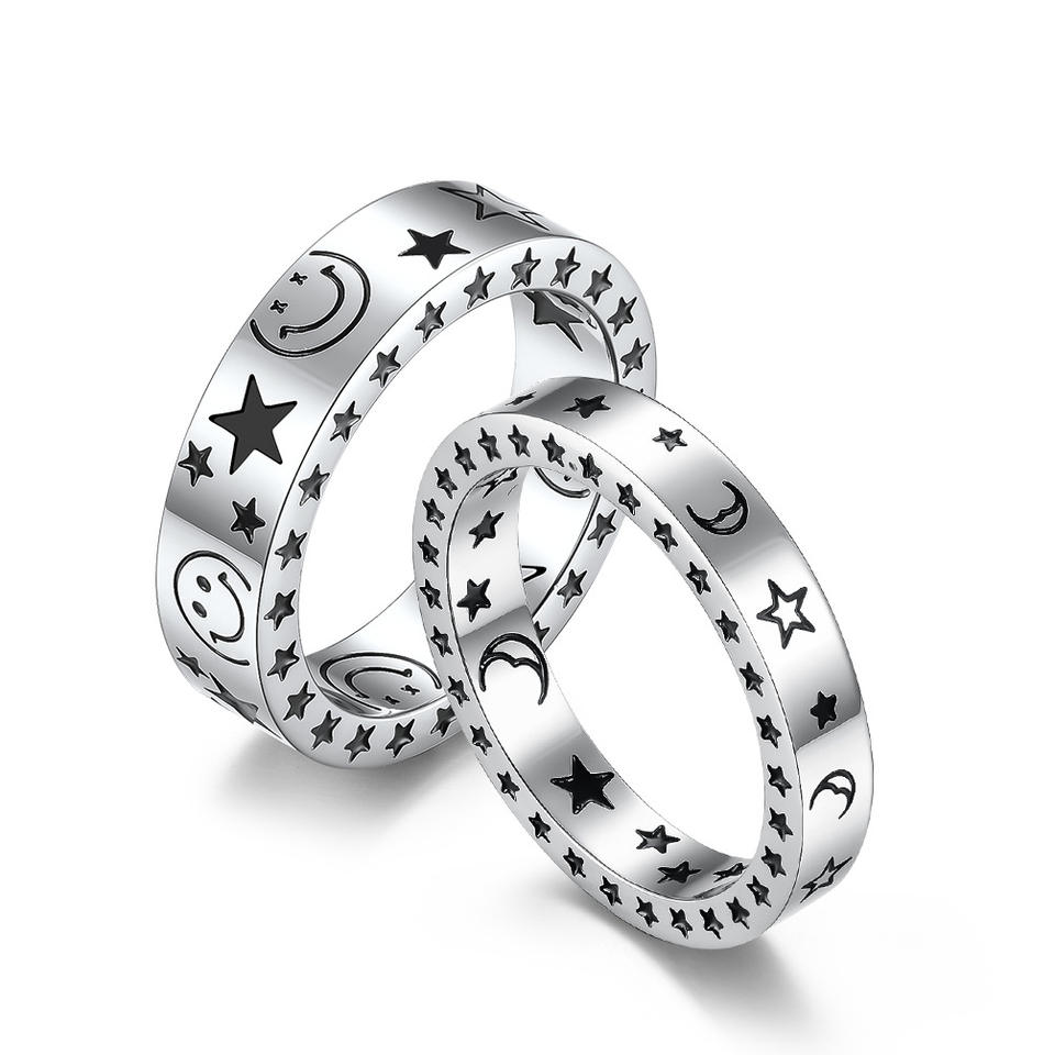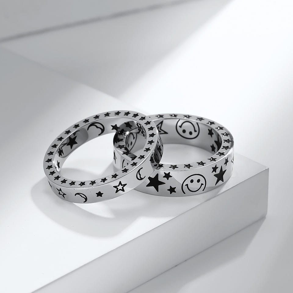 แหวนไทเทเนียมลายดาวและหน้ายิ้ม ขนาด 4 มม. 6 มม. แหวนคู่รักสำหรับทุกเพศ ของขวัญเครื่องประดับแฟชั่น