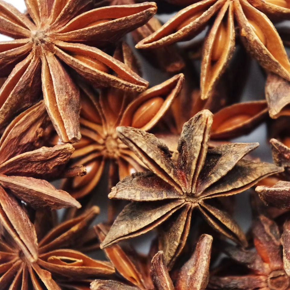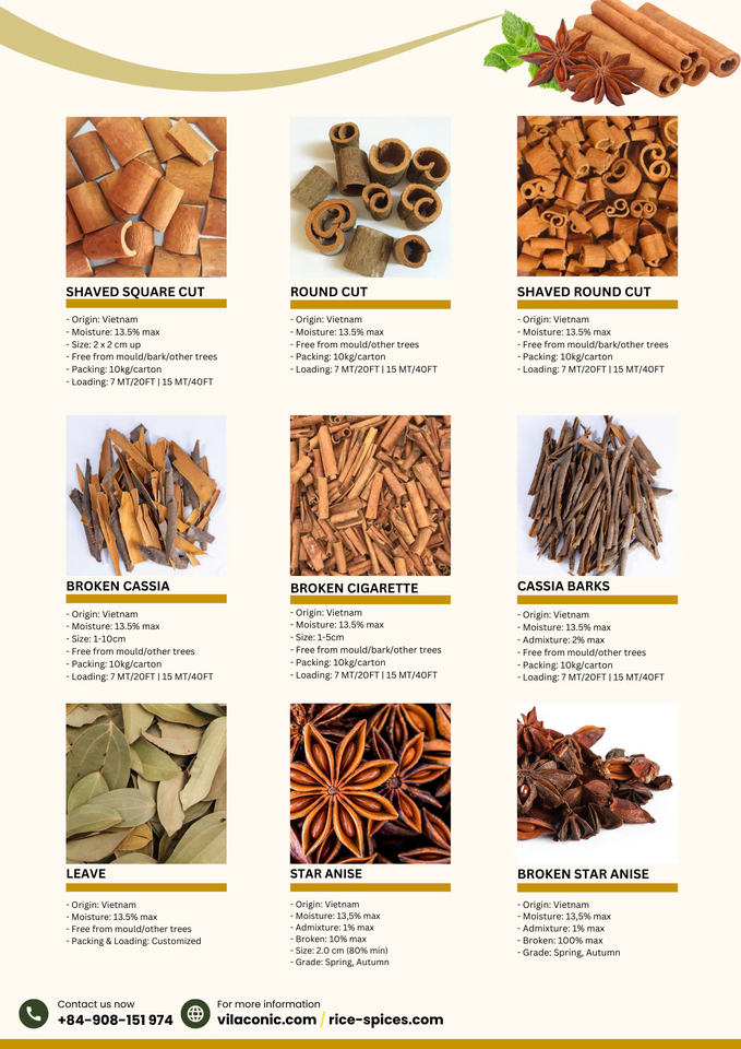 เครื่องเทศคุณภาพสูง: พริกไทย, อบเชย/ขี้เหล็ก, โป๊ยกั๊ก, พริกแห้ง, กระเทียม, ขมิ้น
