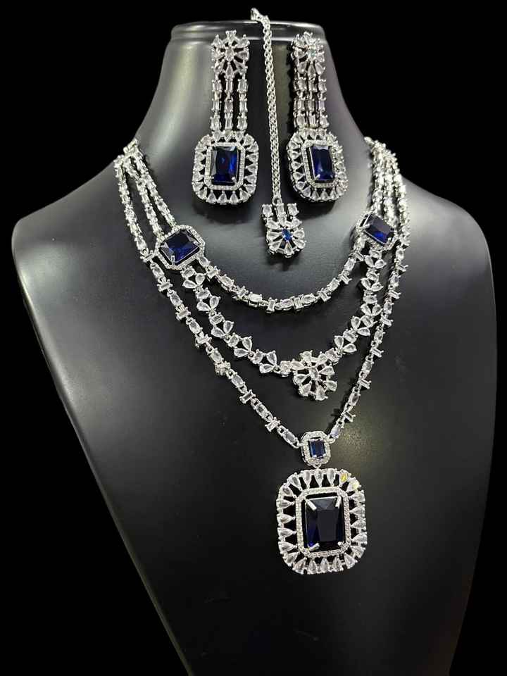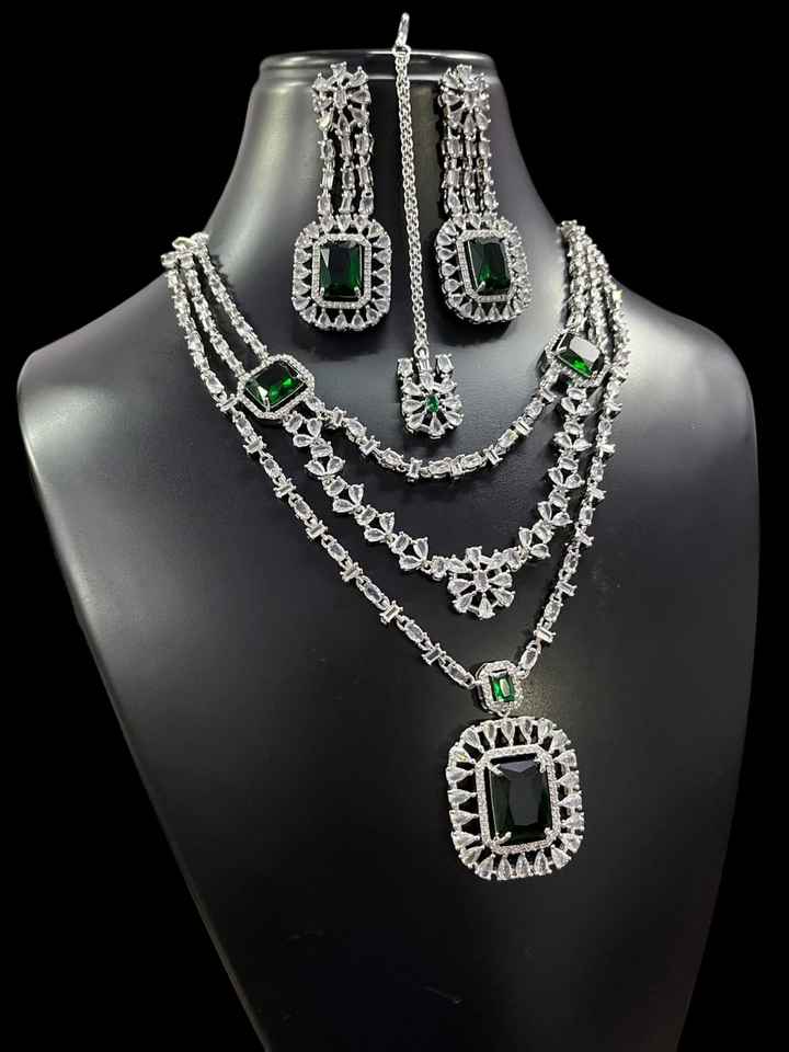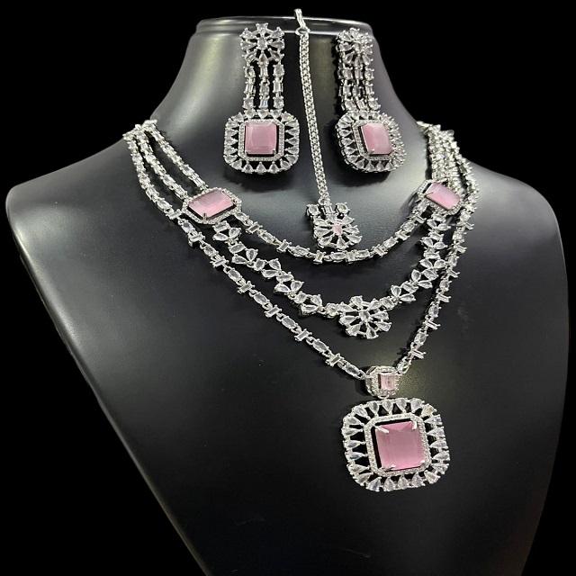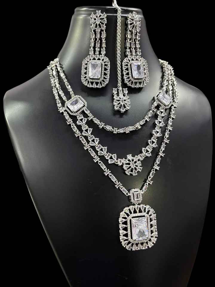 ชุดสร้อยคอสามชั้นประดับเพชรรูปดาวตัดแบบอเมริกันพร้อมต่างหูและ Maang Tikka เหมาะสำหรับสวมใส่ในงานปาร์ตี้ในโอกาสพิเศษ