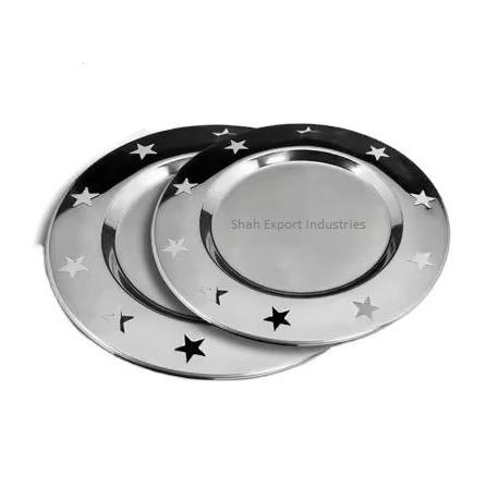 จานและจานโลหะทรงกลมเคลือบสีเงินขอบดีไซน์รูปดาวสำหรับบ้านและงานแต่งงานโต๊ะรับประทานอาหารค่ำ