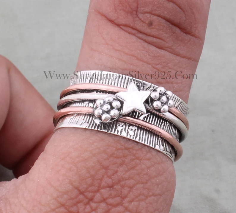 แหวนสปินเนอร์ลายดอกไม้วินเทจเรียนดาวทูโทนสำหรับผู้หญิงและผู้ชายชุบเงินและเงินดีไซน์หลากหลายสำหรับงานแต่งงาน