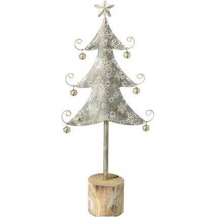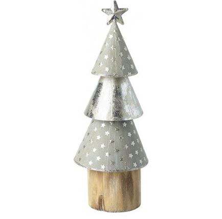 ต้นไม้ทรงกรวยรูปดาวสีเงินและสีเทาพร้อมฐานไม้สำหรับตกแต่งวันคริสต์มาส