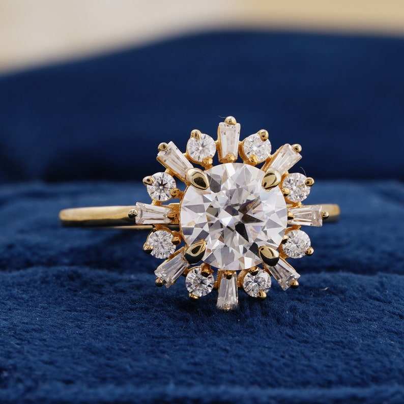 แหวนเพชรรูปดาวเบิร์สฮาโลเบิร์กล้อลายดอกไม้ทรงกลมตัดเป็นวงแหวนเพชรที่สวยงามเป็นของขวัญสำหรับเธอ