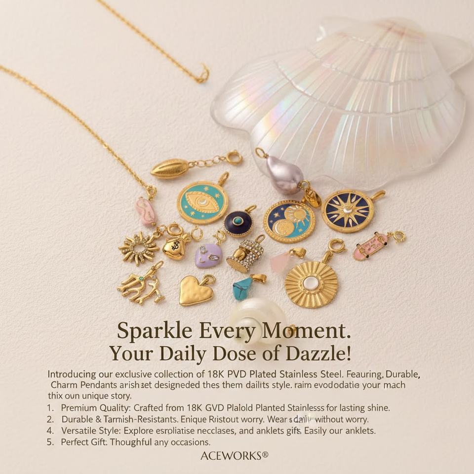 สตาร์ดัสท์ ดีลิชท์ส์ สำหรับทุกวัน | จี้ห้อยคอรูปดวงอาทิตย์ ดวงจันทร์ และดาว ทำจากสแตนเลสสตีลชุบทอง 18K PVD กันน้ำ ทนทาน พร้อมจี้เสริมสำหรับใช้ในชีวิตประจำวัน