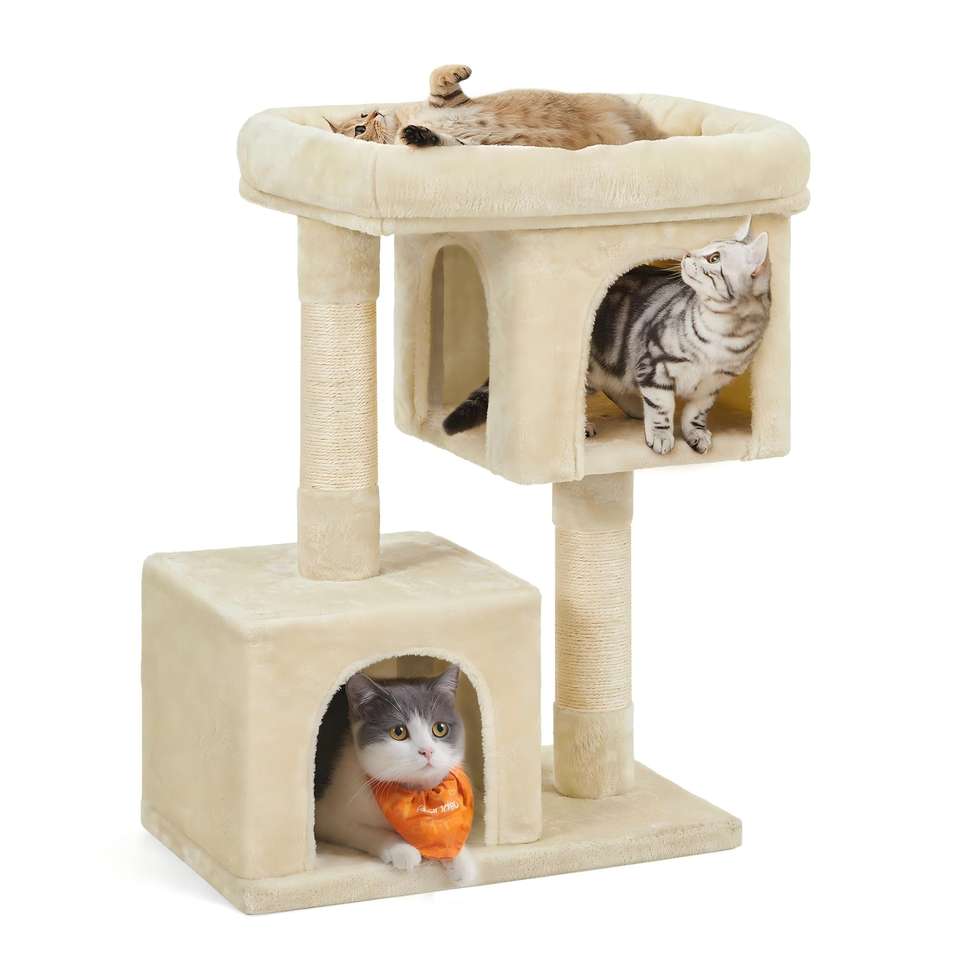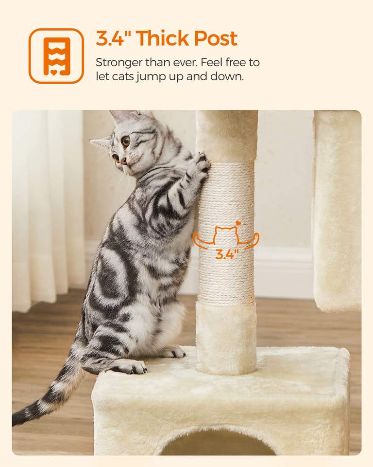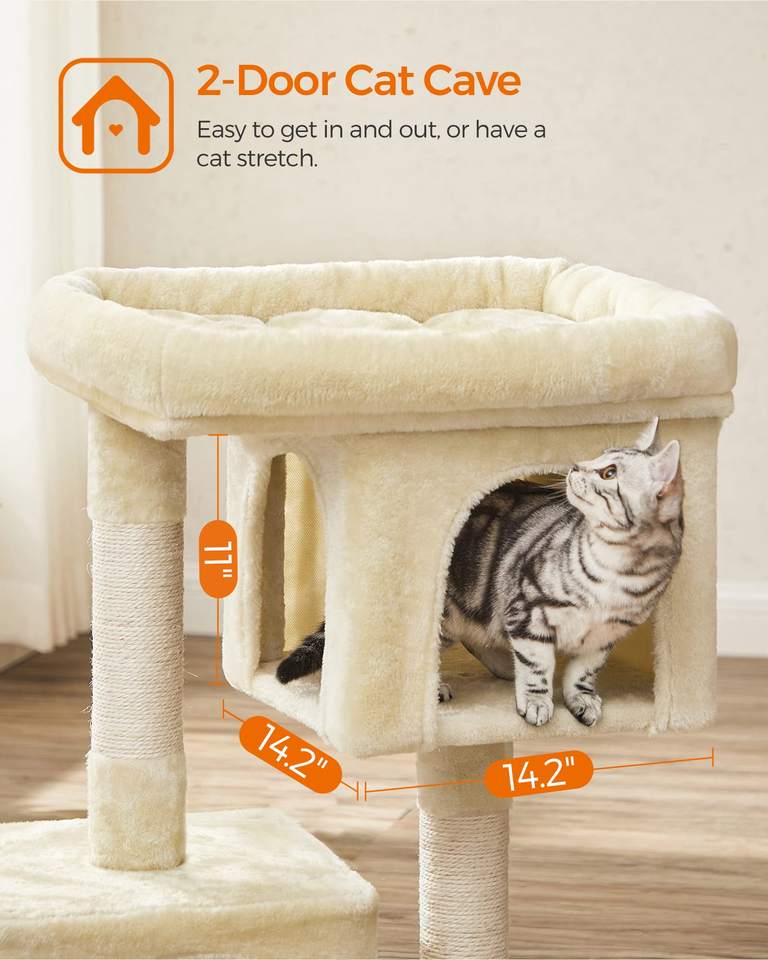 ต้นไม้แมวสตาร์มูน, คอนโดแมวบุผ้ากำมะหยี่สำหรับแมวที่มีน้ำหนักไม่เกิน 16 ปอนด์, ที่นอนขนาดใหญ่, ถ้ำ 2 หลุม, เสาข่วนเล็บ, สีเบจ