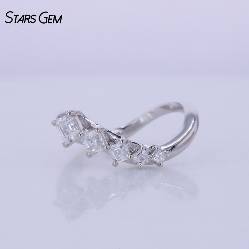 แหวนเพชรทรงอัสเชอร์ 0.58 กะรัต ผลิตในห้องปฏิบัติการ สี DEF ความสะอาด VS ทองคำขาวแท้ 10K ดีไซน์คลาสสิกห้าเม็ด ขนาดปรับได้ สำหรับทุกเพศ