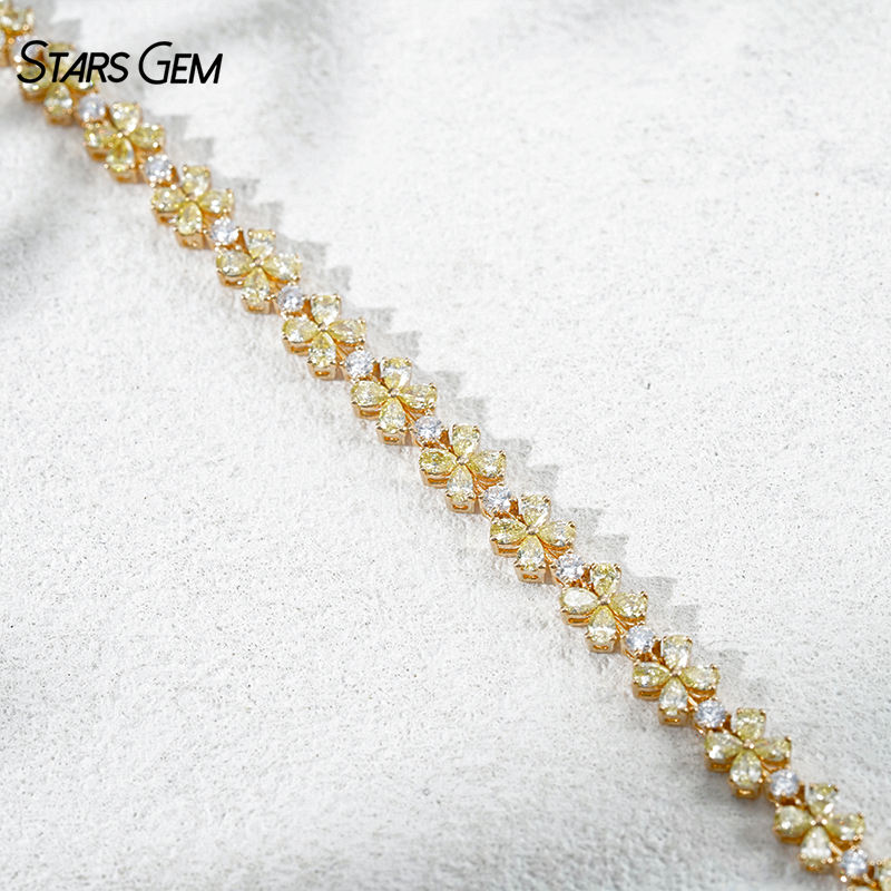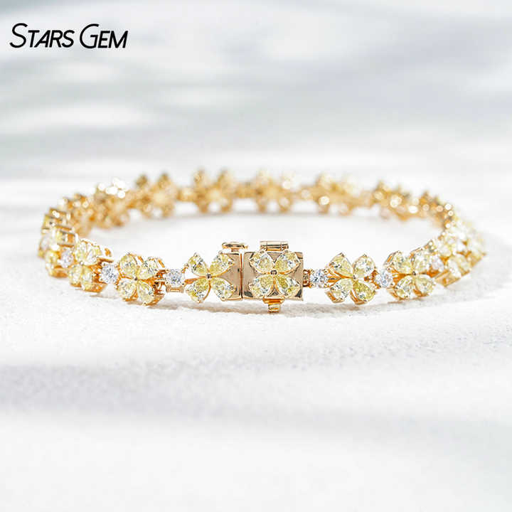 สร้อยข้อมือหรูหราสำหรับทุกเพศ Starsgem เพชรทรงลูกแพร์ 4.24 กะรัต สีเหลืองแฟนซี เพชรเลี้ยงในห้องปฏิบัติการ ทองคำแท้ 18K รูปทรงดอกไม้ เครื่องประดับชั้นดี