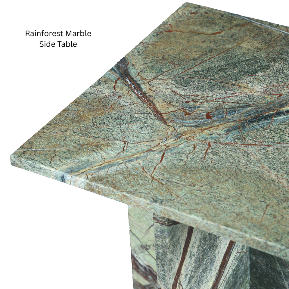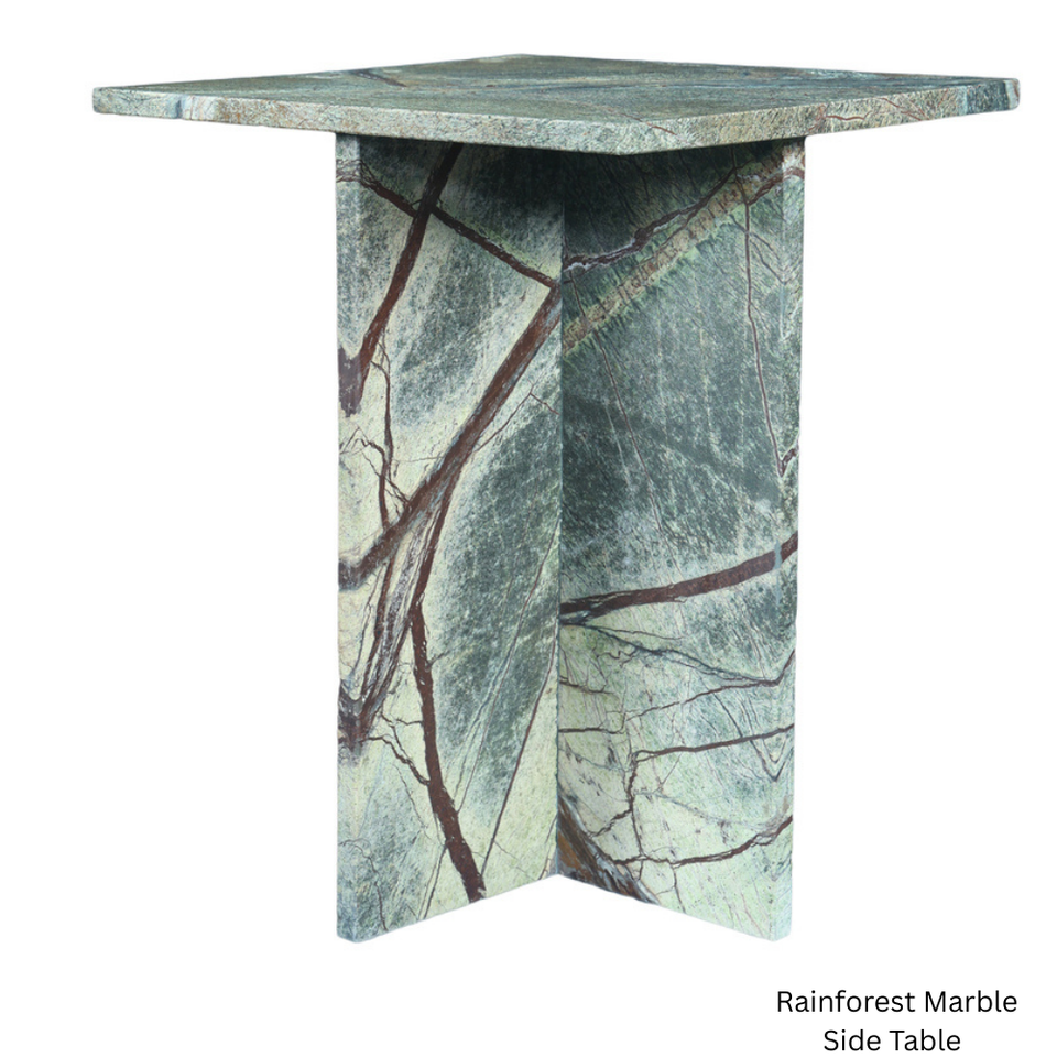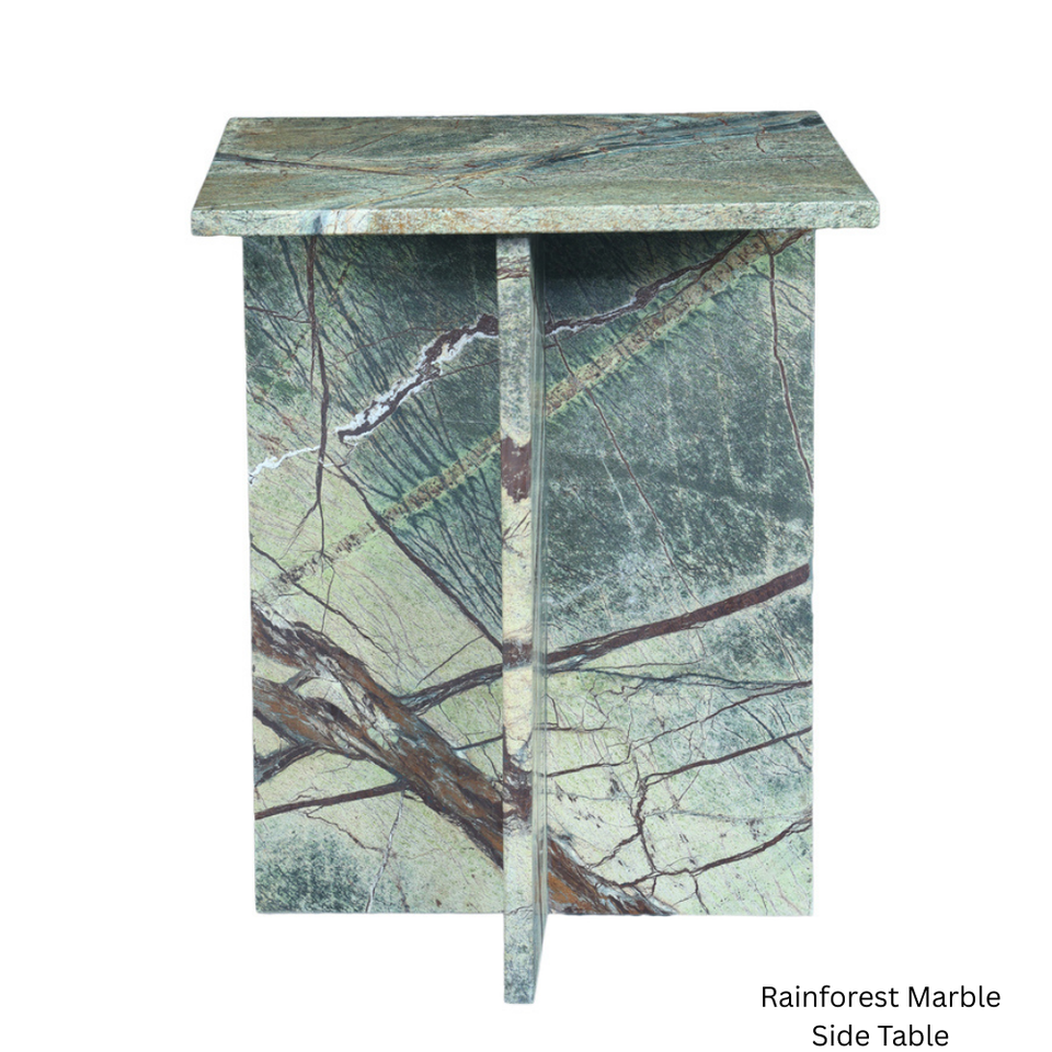โต๊ะข้างเตียงหินอ่อนสีเขียว ดีไซน์ทรงเหลี่ยมคมชัด ฐานทรงกางเขนแข็งแรง งานฝีมือทันสมัย หรูหรา ไม่มีลิ้นชัก