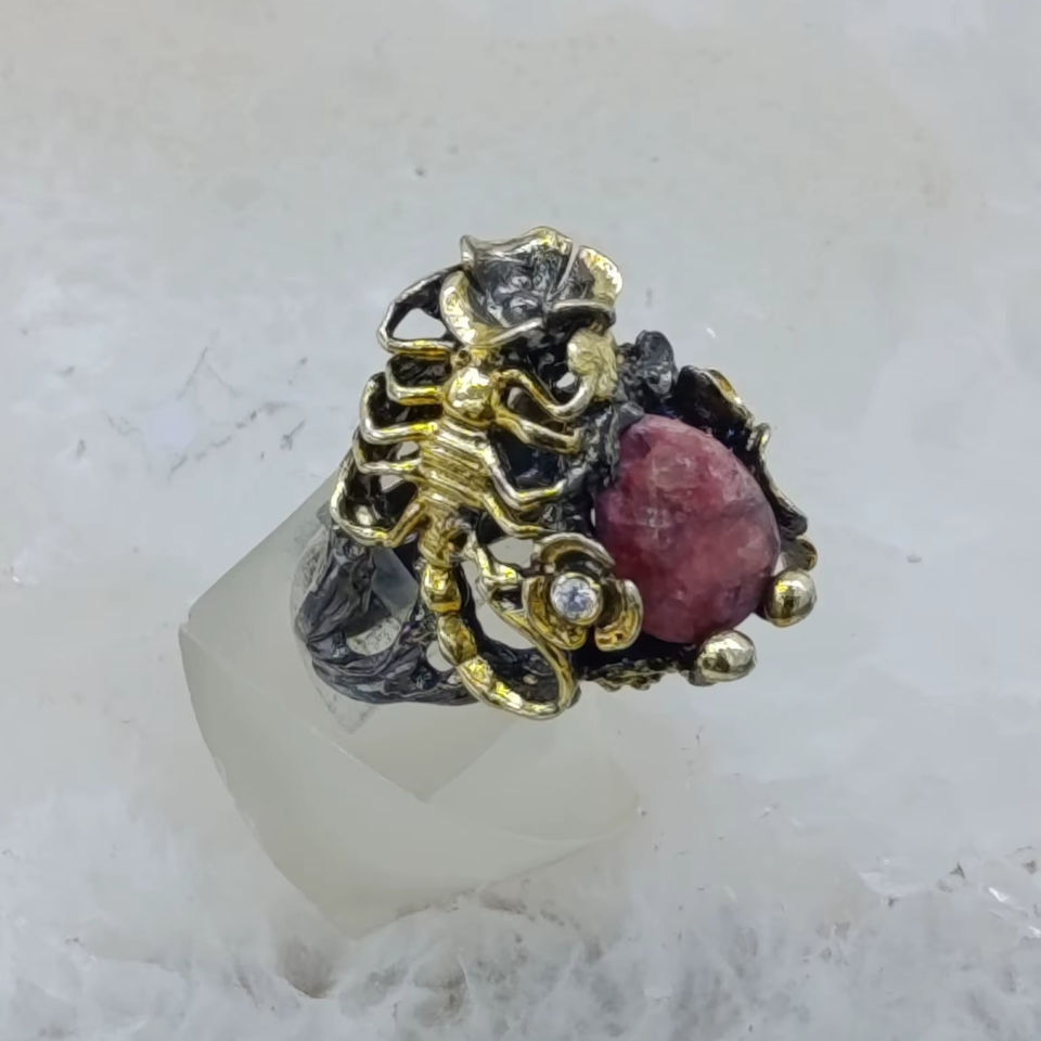 แหวนพลอยรูปแมงป่อง | งานแฮนด์เมด เงินแท้ 925 ชุบโรเดียมสีดำ และชุบทอง 10K ประดับทับทิม สไตล์ดั้งเดิม สำหรับทุกเพศ ผลิตที่อิสตันบูล
