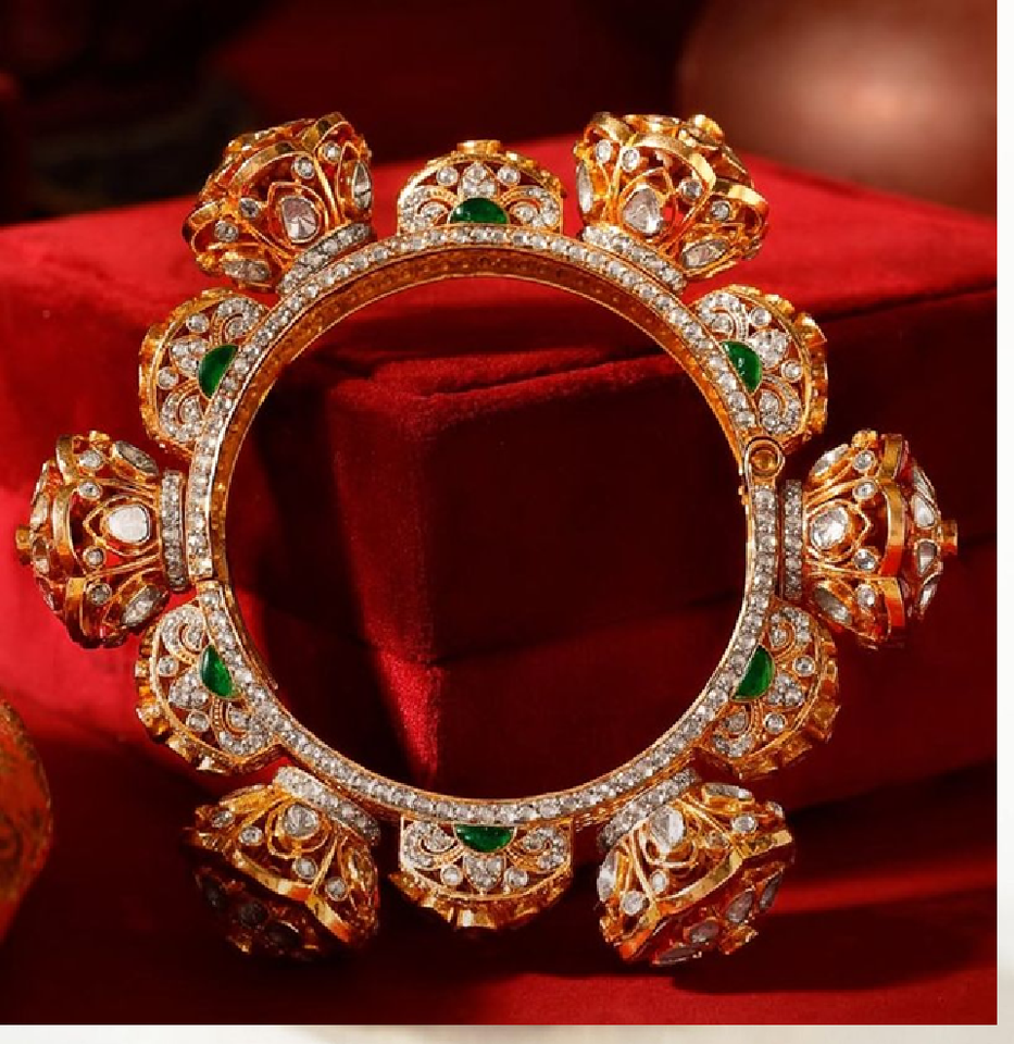 กำไลทองเหลืองประดับด้วยหินทรงกลมขนาดใหญ่คล้ายมรกตและหินสีขาว มีจำหน่ายในราคาขายส่ง