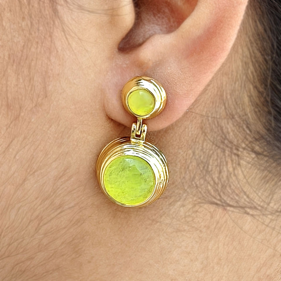 ต่างหูแบบติดหูทรงหยดน้ำประดับด้วยพลอยเพรฮไนต์ทรงกลมคู่ ชุบทอง 18k บนตัวเรือนทองเหลือง เหมาะสำหรับผู้หญิงใส่ไปงานปาร์ตี้