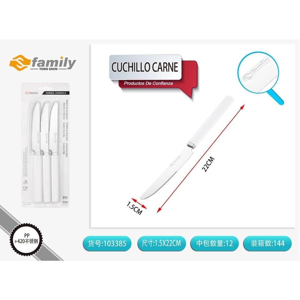 มีดสเต็ก (3ชิ้น) พร้อมที่จับพลาสติก22X1.8ซม-บนโต๊ะอาหาร
