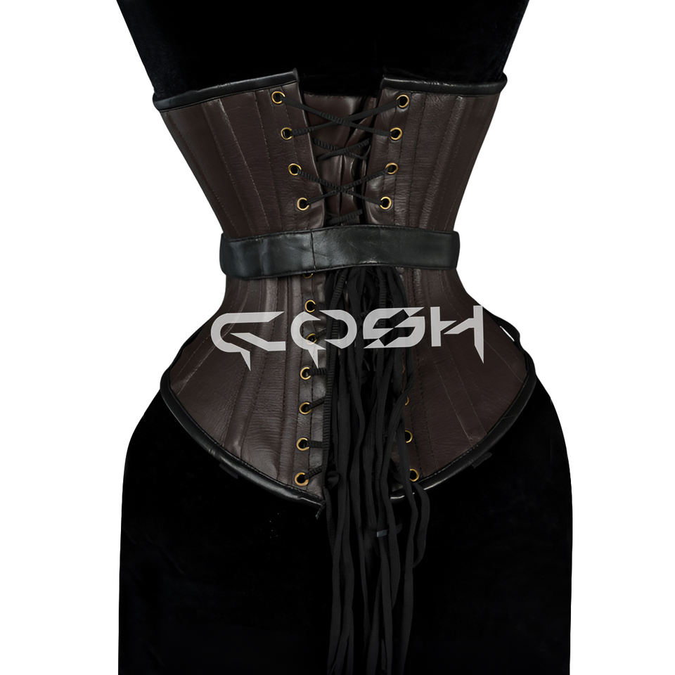 คอร์เซ็ทหนังสีน้ำตาลสไตล์สตีมพังก์แบบรัดใต้อก พร้อมตัวล็อคด้านหน้าและกระเป๋าข้าง คอร์เซ็ทสำหรับกระชับสัดส่วน