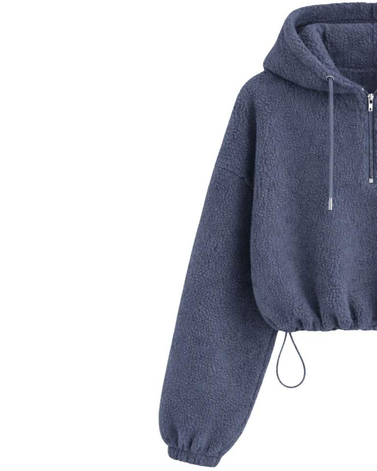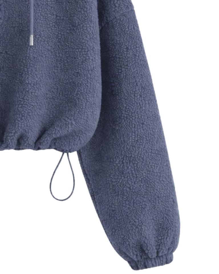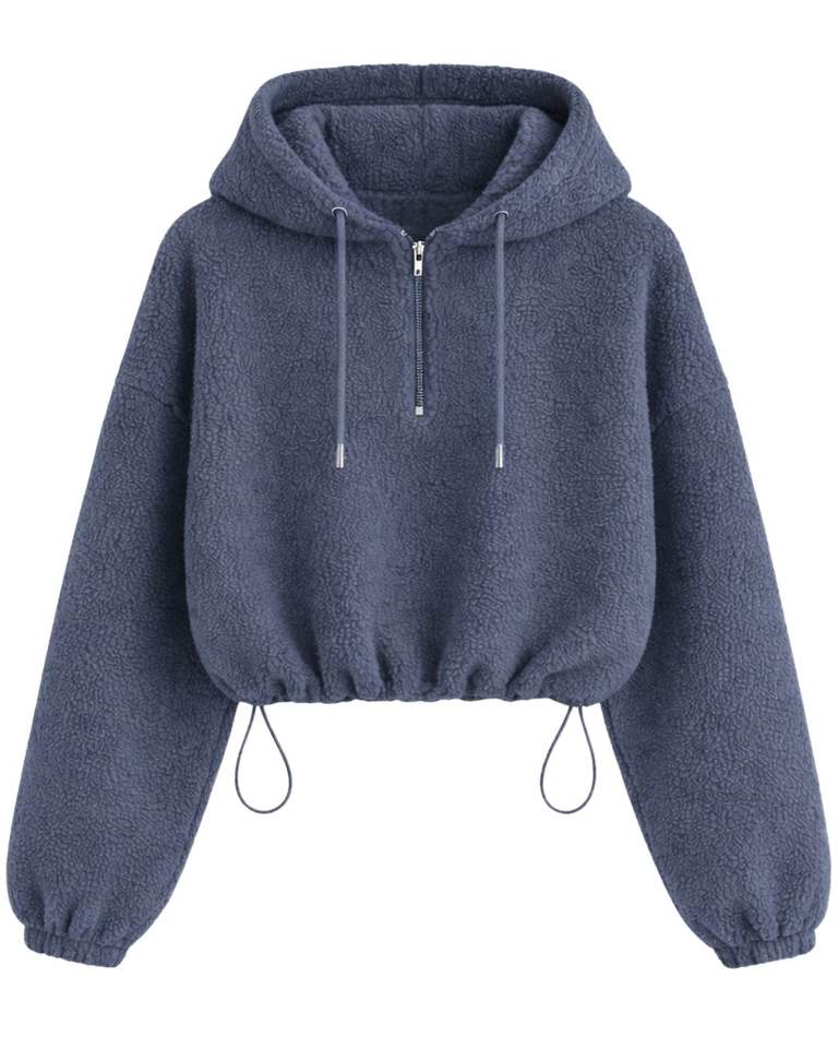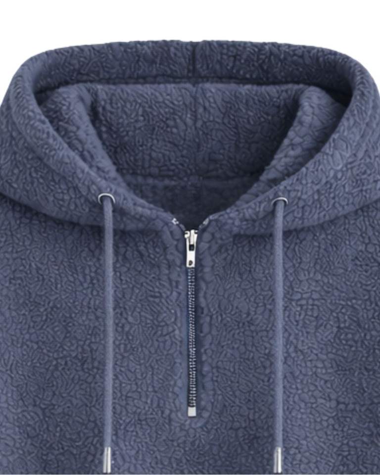 เสื้อฮู้ดครอปผ้าฟลีซสีน้ำเงินกรมท่า แต่งลายเท็กซ์เจอร์ ซิป ¼ ปรับเชือกผูกชายเสื้อได้ สไตล์ลำลอง สตรีทแวร์ อุ่นสบาย สำหรับผู้ชาย รับสกรีนโลโก้