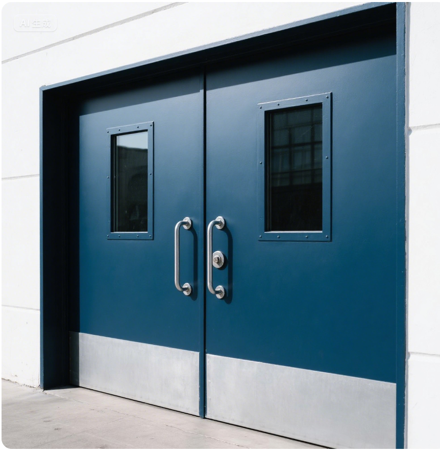 ประตูเหล็กโรงพยาบาลแบบสองบาน พร้อมหน้าต่างกระจก และแผ่นกันเตะสแตนเลส - แบบปิดสนิท