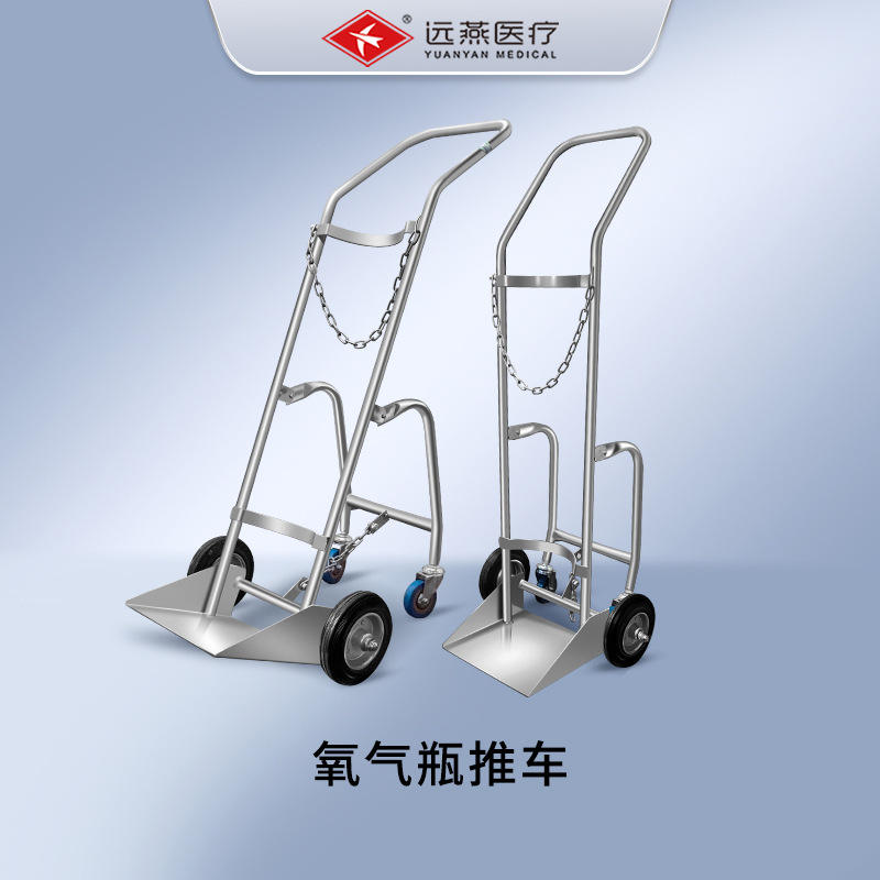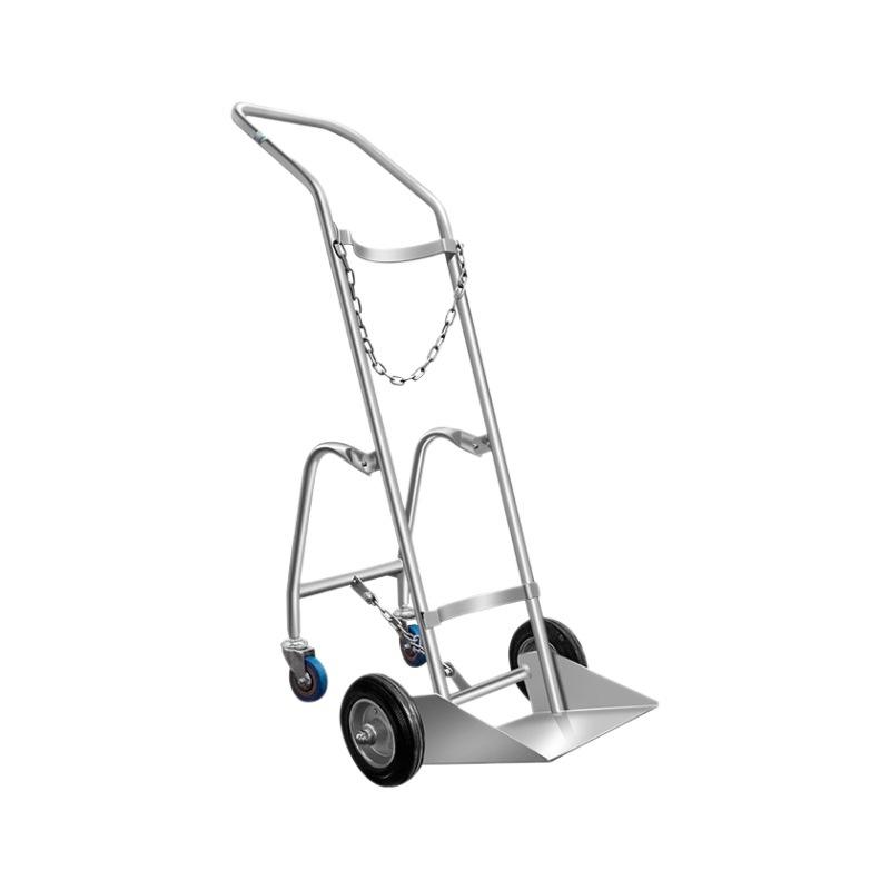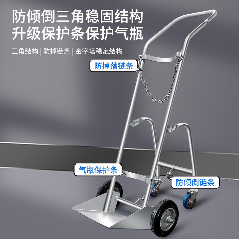 รถเข็นถังออกซิเจนเหล็ก 40 ลิตร แบบสามล้อ อุปกรณ์ขนย้ายอุตสาหกรรม พร้อมโซ่เคลือบสีเงิน ดีไซน์พื้นแบบเคลือบผง