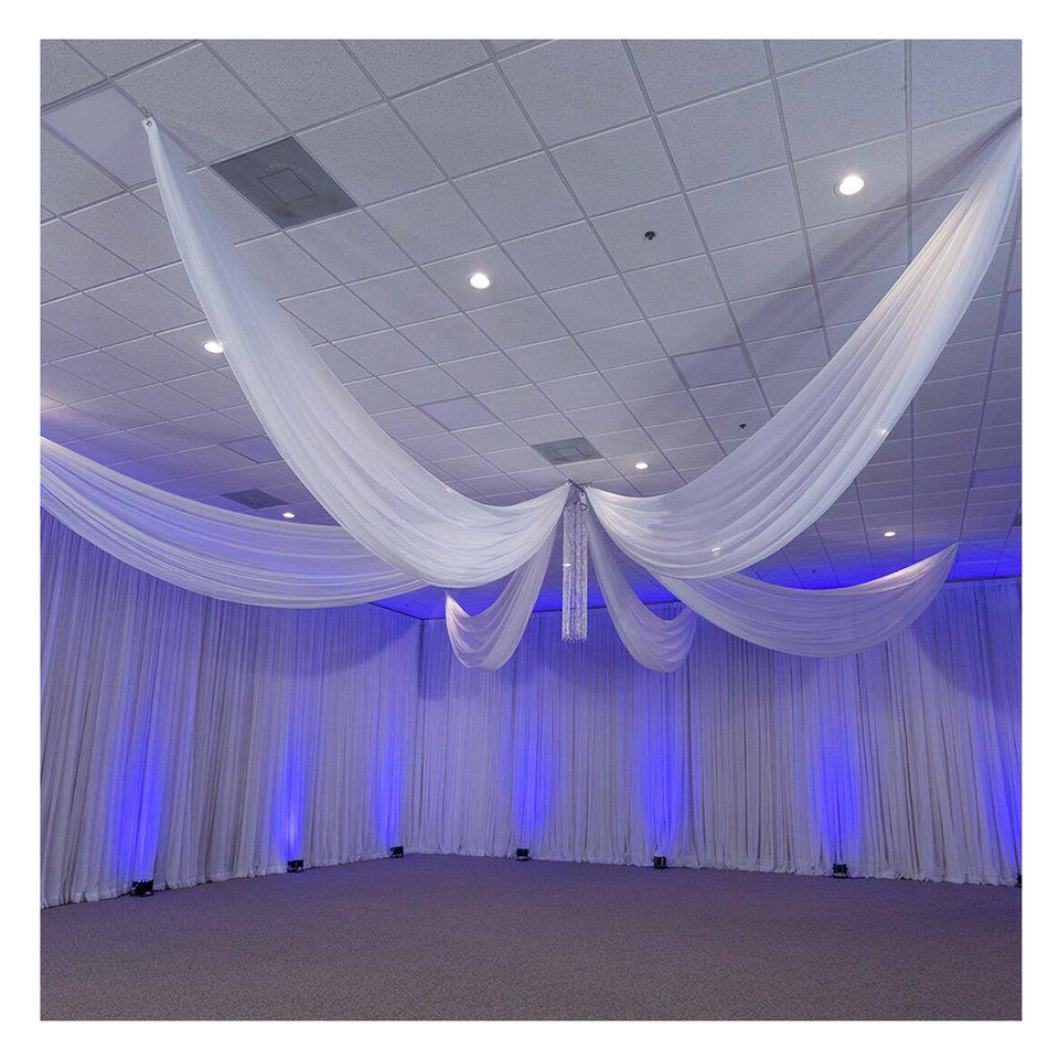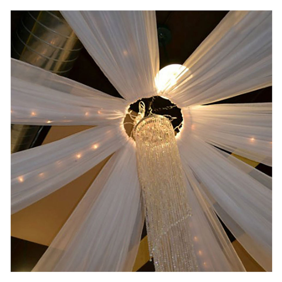 ฉากหลังเหล็กใส ตกแต่งโต๊ะ ผ้าม่าน งานแต่งงาน ผ้าคลุมเพดาน