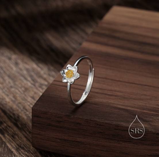 แหวนดอกแดฟโฟดิลเงินสเตอร์ลิง ปรับขนาดได้ แหวนดอกแดฟโฟดิล แหวนเงินและทอง แหวนดอกไม้ ดีไซน์สวยงามและละเอียดอ่อน