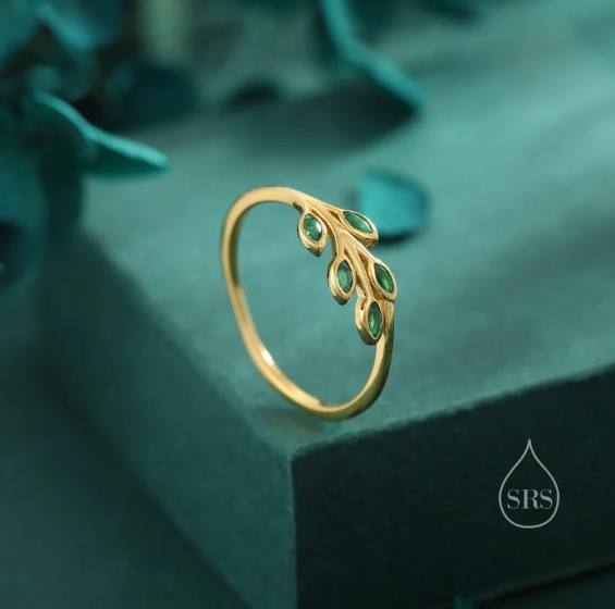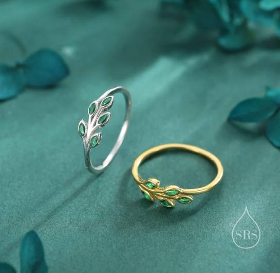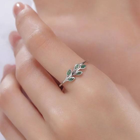 แหวนใบไม้เงินแท้ประดับเพชร CZ สีเขียว แหวนใบมะกอกขนาดเล็ก แหวนใบไม้ที่ได้รับแรงบันดาลใจจากธรรมชาติ แหวนใบไม้สีเขียว