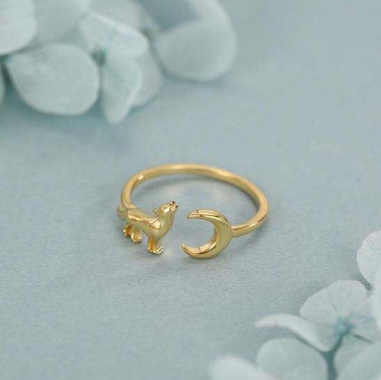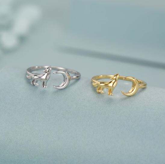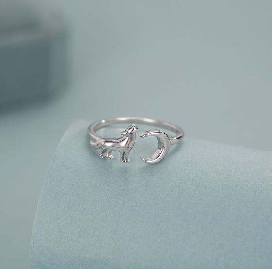 แหวนเงินแท้รูปหมาป่าร้องไห้และพระจันทร์ แหวนรูปสัตว์แบบปรับขนาดได้