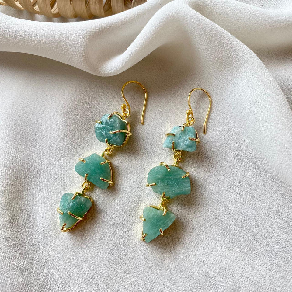 ต่างหูแบบห้อยทำจากหินอเมซอนแบบสามแฉกชุบทองสำหรับเครื่องประดับอัญมณีหรือของขวัญ