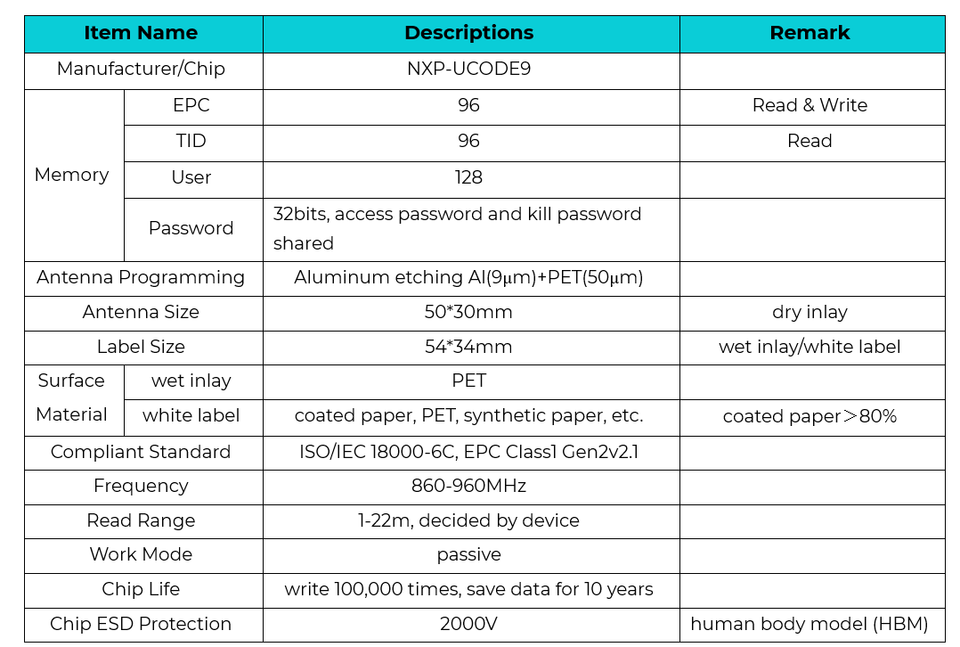 ลักษณะ:อินเลย์ RFID UHF ขนาด 54x34 มม. (U9)