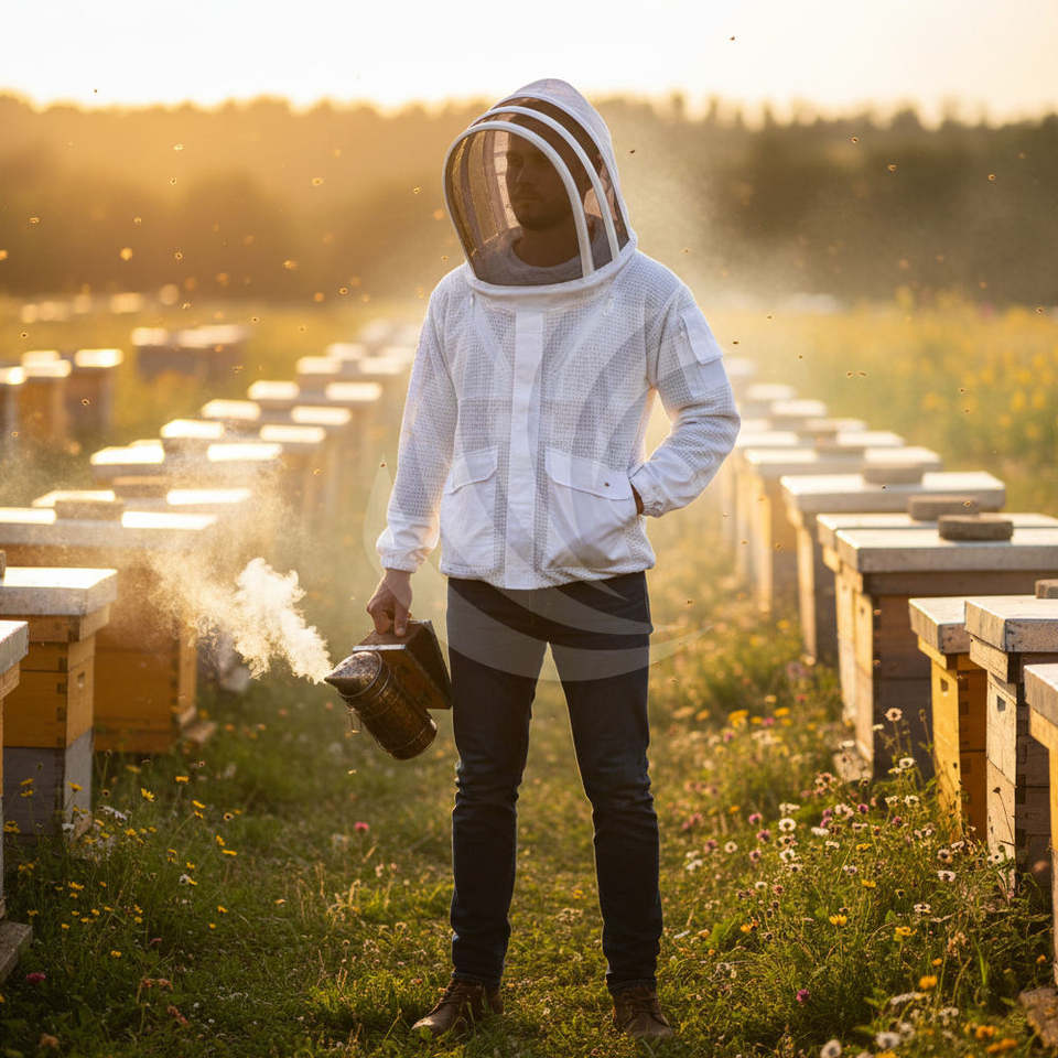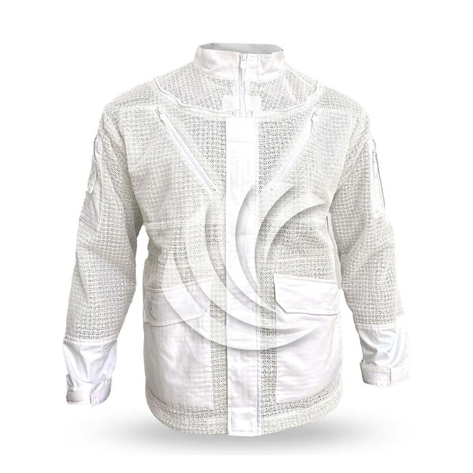 เสื้อป้องกันผึ้งกัดพร้อมผ้าคลุมหน้าแบบรั้ว ซิปด้านหน้า มีหลายช่อง มีจำหน่ายอุปกรณ์เลี้ยงผึ้งราคาส่ง