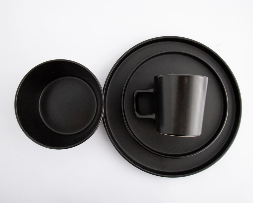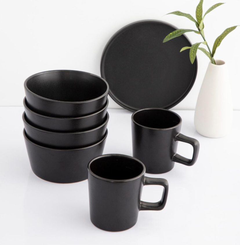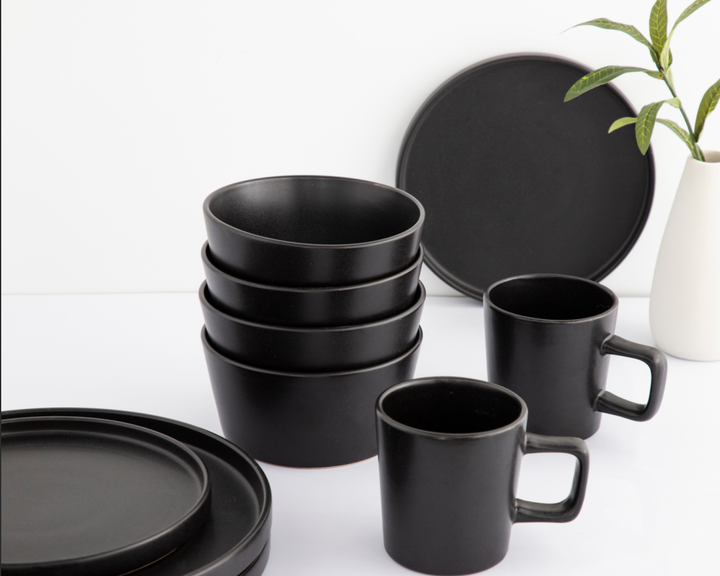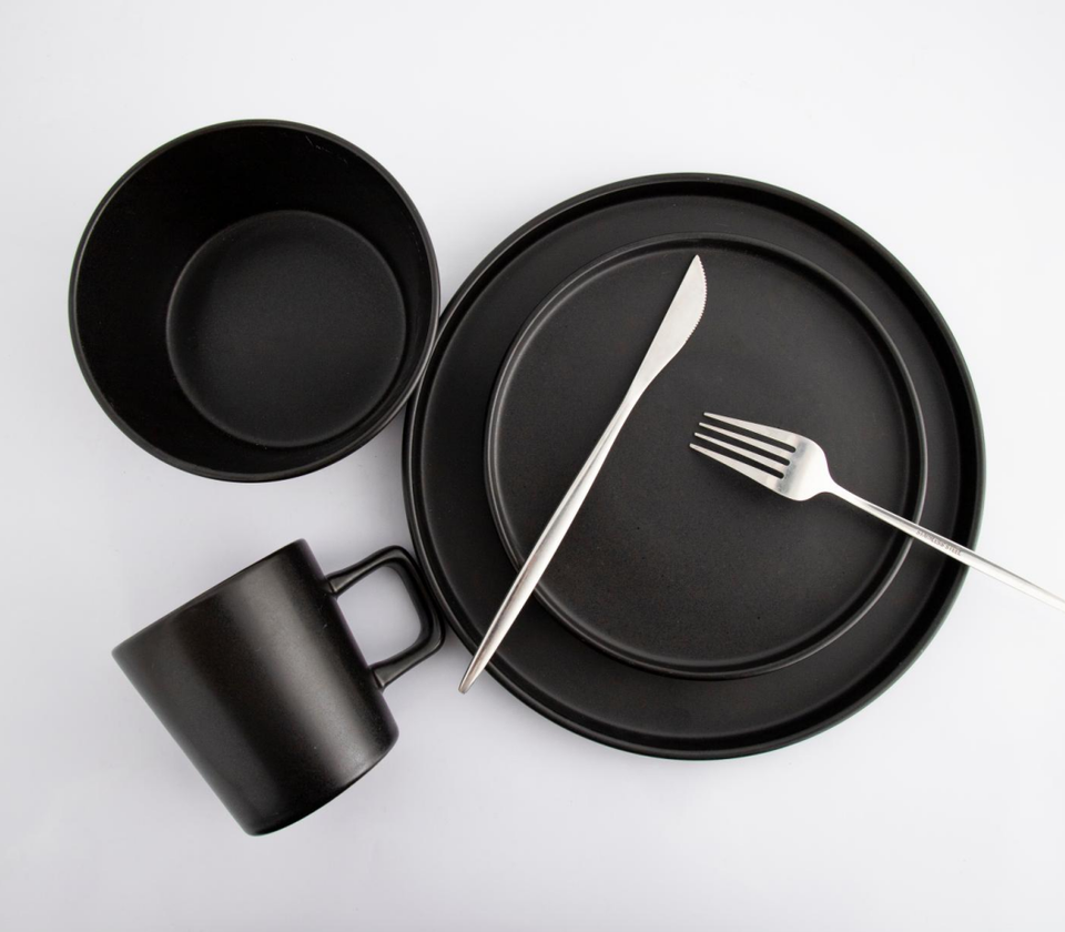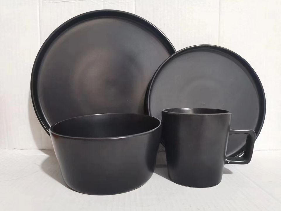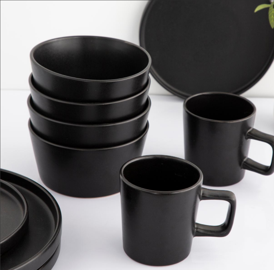 ชุดอาหารเย็นเซรามิกสีดำด้านคุณภาพสูง สำหรับ 4 ท่าน ประกอบด้วยจาน ชาม แก้วน้ำ ขายส่งภาชนะบนโต๊ะอาหารสำหรับบ้านและร้านอาหาร