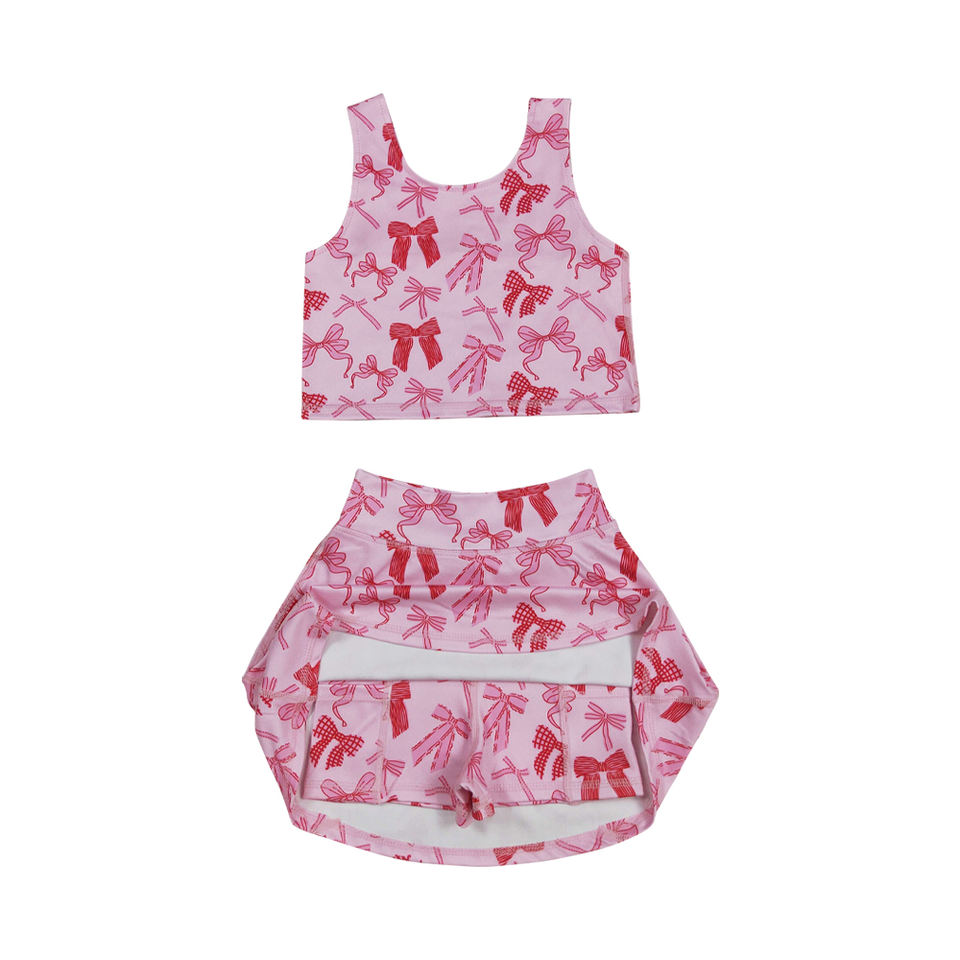 เสื้อกล้ามกางเกงขาสั้นผ้าฝ้ายออร์แกนิคสีชมพูมีโบว์พิมพ์ลายสำหรับเด็กผู้หญิงชุดเล่นเทนนิสฤดูร้อนเสื้อผ้าบูติกแฟชั่นเล่นกีฬาโยคะ