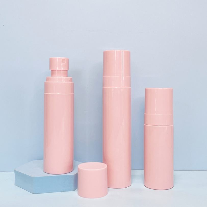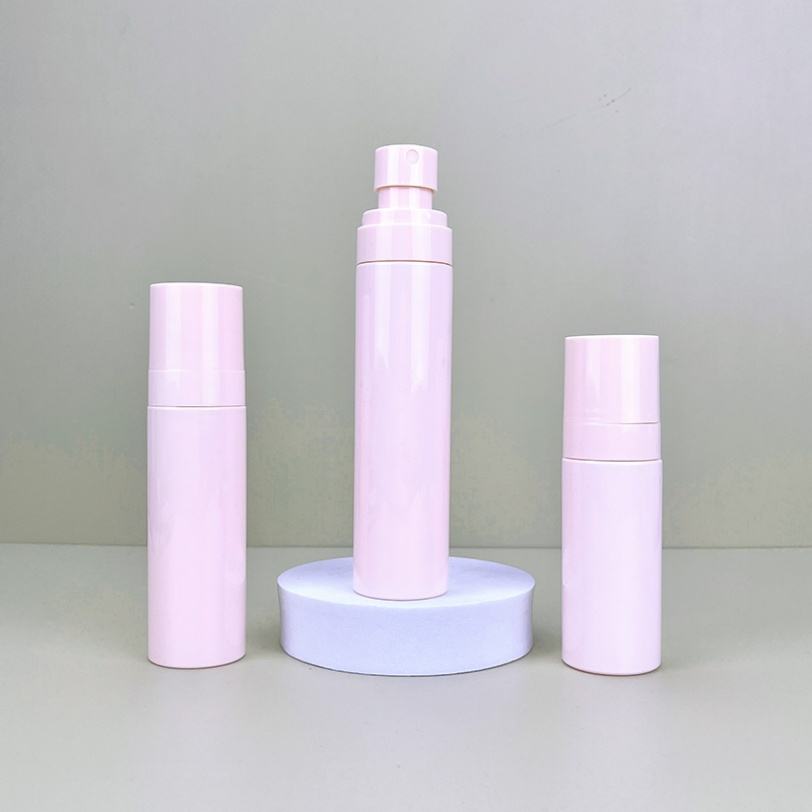 ขวดสเปรย์พลาสติก PET ฝาแบน สีชมพู ขนาด 60 มล. 80 มล. 100 มล. สำหรับบรรจุภัณฑ์ผลิตภัณฑ์ดูแลผิวและผลิตภัณฑ์ดูแลส่วนบุคคล