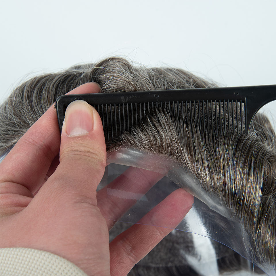 ท็อปเปอร์ผมแท้สำหรับผู้ชายชาวอินเดีย แบบธรรมชาติ ขนาด 8x10 นิ้ว ผิว PU บางพิเศษ แบบ V-LOOP ผูกปมแบบแยกเส้นเดี่ยว