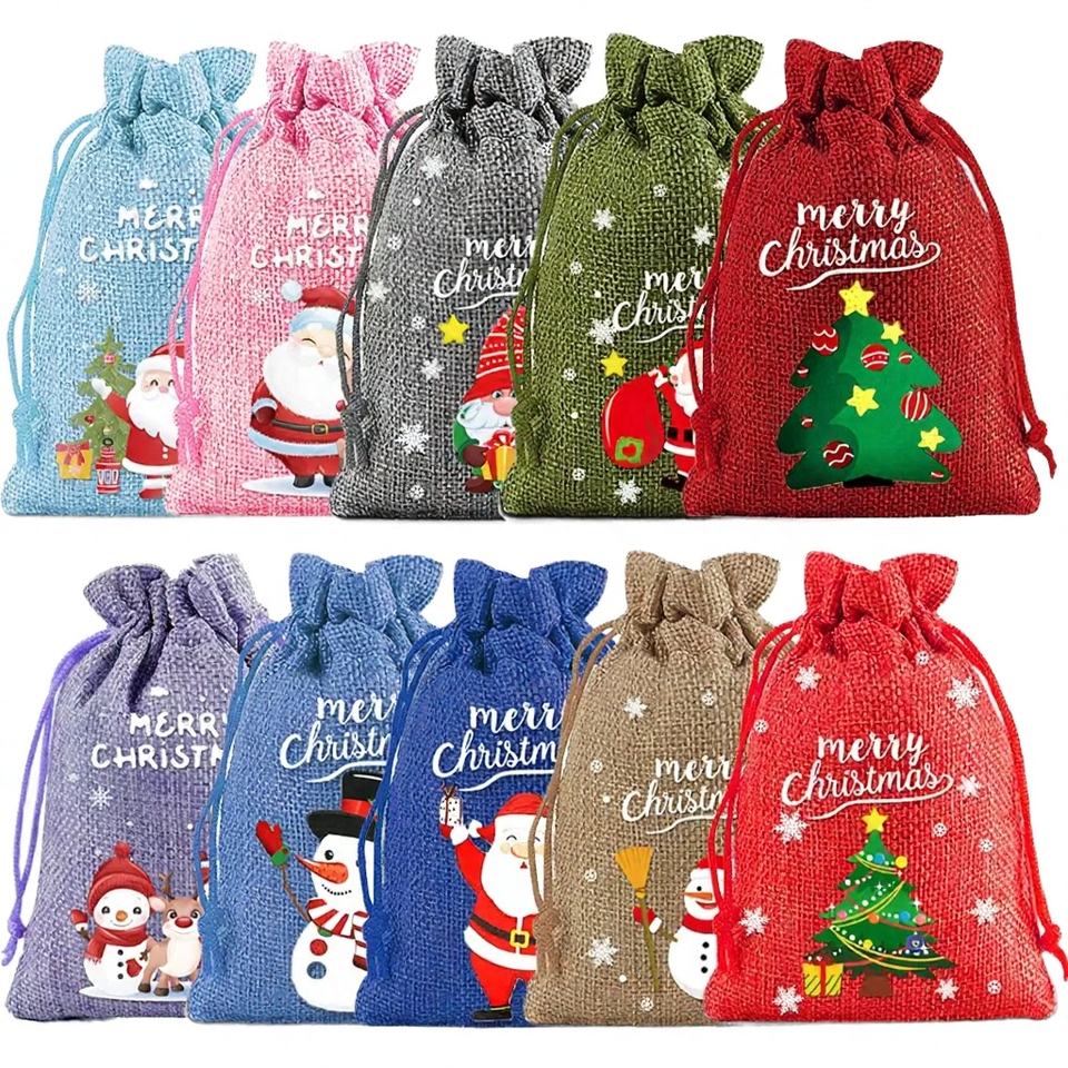 ถุงผ้าฝ้ายรีไซเคิลสำหรับคริสต์มาสสุดหรู พร้อมเชือกผูก ซับในผ้าซาติน พิมพ์ลายสกรีน พิมพ์ลายแบบ Water Transfer รับผลิตตามสั่งจำนวนมากสำหรับเป็นของขวัญ
