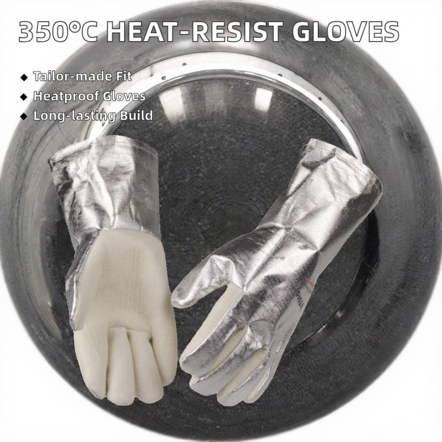 ถุงมือกันความร้อนสำหรับเตาอบอุตสาหกรรม ทนความร้อนได้ถึง 350 องศาเซลเซียส ผลิตจากอลูมิเนียมฟอยล์หุ้มฉนวนด้วยใยเมตาอะรามิด สำหรับใช้กับเตาอบ
