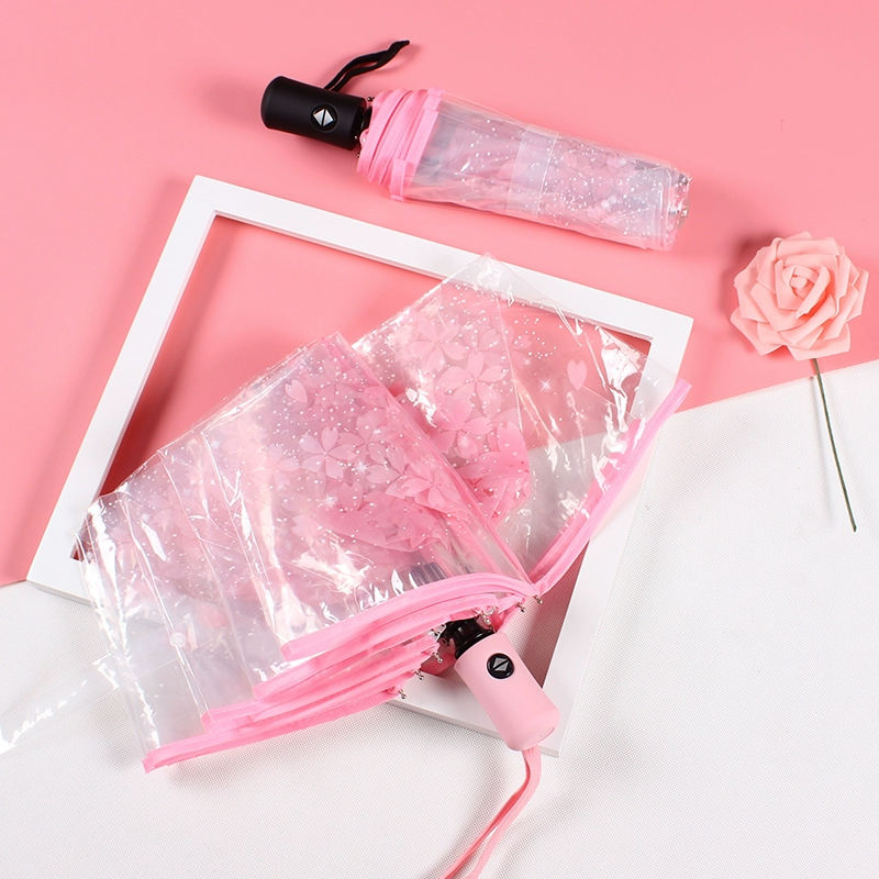 ร่มซากุระใสแบบใหม่ ด้ามจับสีชมพู อัตโนมัติ พับเก็บได้ สำหรับผู้หญิง
